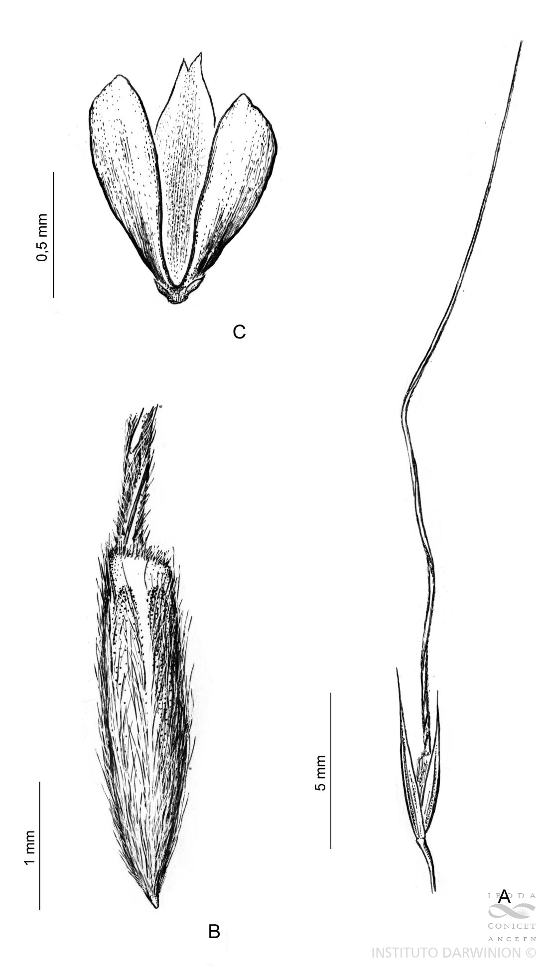 Plantas perennes, cespitosas, medianamente robustas, de 70-100 cm de alto; cañas cilíndricas, ca.1 mm de diámetro, erguidas, rectas, simples, paucinodes; nudos conspicuos, comprimidos, castaños a rojizos, glabros o pubérulos; entrenudos longitudinalmente estriados, glabros a pubérulos; vainas foliares estriadas, mayores que los entrenudos, pubescentes, más conspicuamente hacia los bordes en la región del cuello, con margenes hialinos, glabros o ciliados; lígulas truncadas, 0,2- 0,3 mm de largo, membranáceas, con margen laciniado, glabras; láminas foliares lineares, convolutas o planas, de 25-35 cm x 2-4 mm, ambas caras estriadas, pubérulas, con margenes escabriúsculos. Inflorescencia nutante, pauciflora o pluriflora, extendida, de 25-40 cm de largo; raquis cilíndrico, ligeramente estriado, escabroso, ramas y pedicelos angulosos, hispídulos. Espiguillas fusiformes, de 6-7 mm de largo; glumas subiguales, de 4-6 mm de largo, mayores que el antecio, cortamente atenuadas, membranáceas, glabras, 3-nervias, hispídulas sobre los nervios; lemma cilíndrica, ligeramente fusiforme, de 2-3,5 x 0,5-0,7 mm de diámetro, papilosa y con densos pelos adpresos en toda la superficie, los superiores no pasan la corona; corona conspicua, continua con el cuerpo de la lemma, blanquecina, glabra, con escasos pelitos cortos (0,1 mm de largo) hacia el borde; arista 2-geniculada, de 1,5-3,5 cm de largo, hispídula en toda su extensión, grácil, caediza; antopodio obtuso, oblicuamente truncado, de 0,6-0,7 mm de largo, densamente viloso; pálea obtusa, de 0,3-0,6 mm de largo, glabra; lodículas 2, anchamente oblongas, ca. 1 mm de largo; cariopsis cilíndrica, de 1,7-2 mm de largo; hilo linear 2/3 del largo de la cariopsis.