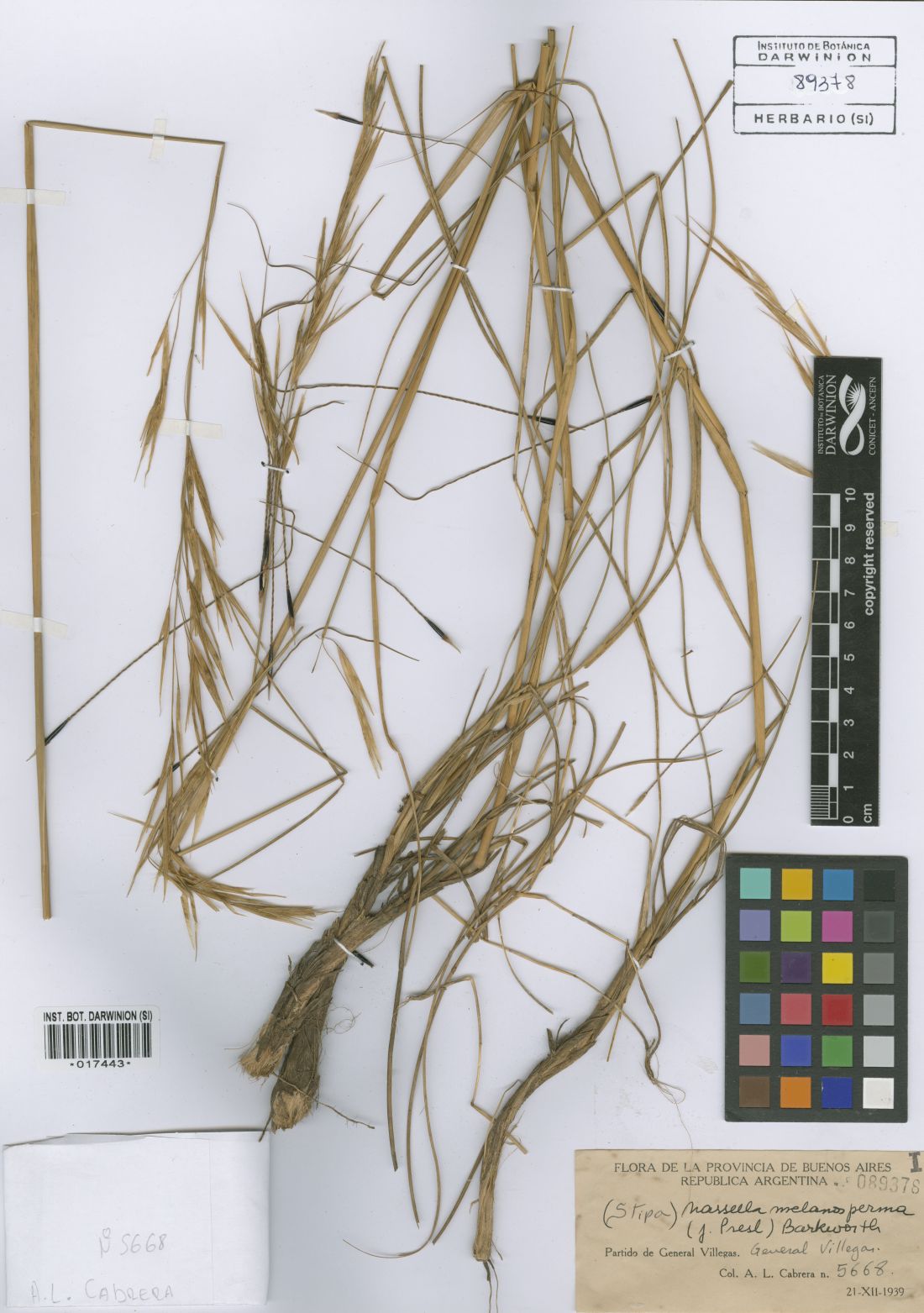 Observaciones: Nassella melanosperma conforma un grupo de especies que se caracterizan por presentar antecios de 6-20 mm de largo con antopodio agudo de 1-8 mm. Sin embargo, puede distinguirse de las demás especies de este grupo por su lemma glabra, con pelos solamente en el antopodio.