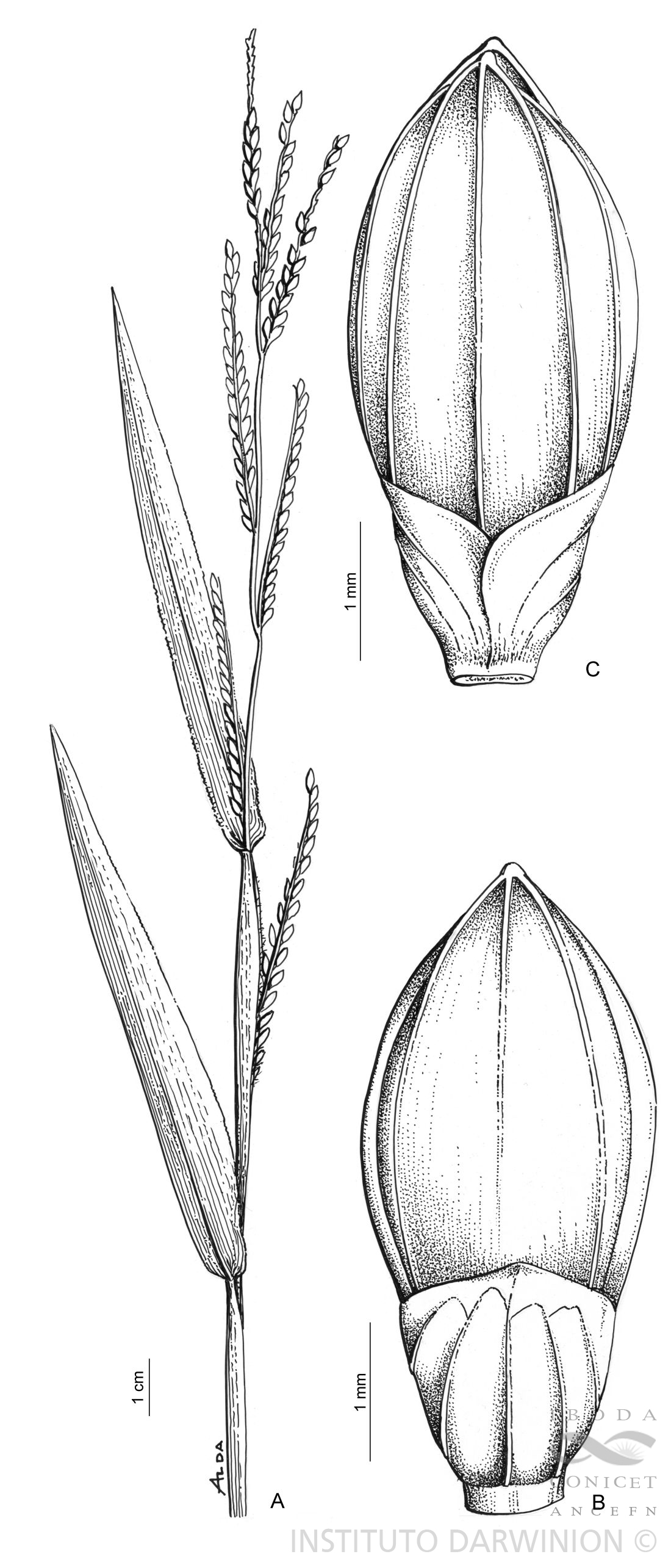 Plantas anuales de 2-100 cm de alto; cañas decumbentes, geniculadas, ramificadas y arraigadas en los nudos inferiores, luego erguidas; entrenudos de 3-15 cm de largo, glabros, comprimidos; nudos glabros, comprimidos, castaños; vainas de 3-10 cm de largo, glabras, flojas, con un margen pestañoso, el restante membranáceo; lígulas de base cortamente membranácea, luego largamente pestañosa, hasta de 1 mm de largo; cuello glabro; láminas lanceoladas a linear-lanceoladas, de 4-25 cm x 8-20 mm de ancho, glabras en ambas caras, base cordada, de ápice agudo, bordes cartilaginosos, escabrosos, largamente pestañosos hacia la base. Inflorescencias de contorno oblongo, bilaterales, exertas o subincluidas en las vainas foliares, de 6-25 x 2-7 cm, terminales; eje principal anguloso, glabro, escabroso, en ocasiones terminando en un eje estéril, con 3-8 ramificaciones racemosas alternas, ascendentes, distantes entre sí; raquis de las ramificaciones de 2,5-6,5(-10) cm x 1-1,5 mm, plano, glabro, de bordes escabrosos, terminando en una espiguilla desarrollada; pedicelos de 0,5-0,7 mm de largo, cortos, solitarios, angulosos, glabros, con ángulos finamente escabrosos; espiguillas distribuidas en 2 series sobre un lado del raquis, solitarias, imbricadas a ligeramente distantes. Espiguillas largamente elipsoides, de 4-6 x 1,9-2,2 mm, glabras, verde pálidas; gluma superior y lemma inferior subiguales, con nervios marcados y vénulas transversales poco manifiestas hacia la porción apical; gluma inferior anchamente ovada, de 1,5-2,1 mm de largo, ? o menos del largo de la espiguilla, adaxial, glabra, membranácea, abrazadora, 9-nervia, los nervios anastomosados junto al ápice; gluma superior de 3-4,2 mm de largo, glabra, membranácea, 7(-9)-nervia; gluma inferior y superior separadas por un entrenudo manifiesto de la raquilla ca. 0,5 mm de largo; lemma inferior glumiforme, 5-nervia, con el dorso comprimido longitudinalmente; pálea inferior lanceolada, de 2,7-3,6 x 1,2-1,5 mm, hialina, glabra; flor inferior ausente; antecio superior de contorno oblongo, de 2,7-3,6 x 1,5-2 mm, pajizo, biplano, endurecido, transversalmente rugoso; lemma de ápice obtuso, mucronada, dorso plano y rugoso, bordes involutos, lisos y lustrosos; lodículas 2, ca. 0,35 mm de largo; estambres 3, anteras de 0,9-1 mm de largo; cariopsis ovoide, ca. 2,5 x 1,5 mm, pajiza; hilo elíptico, sub-basal; embrión ¾ del largo de la cariopsis.