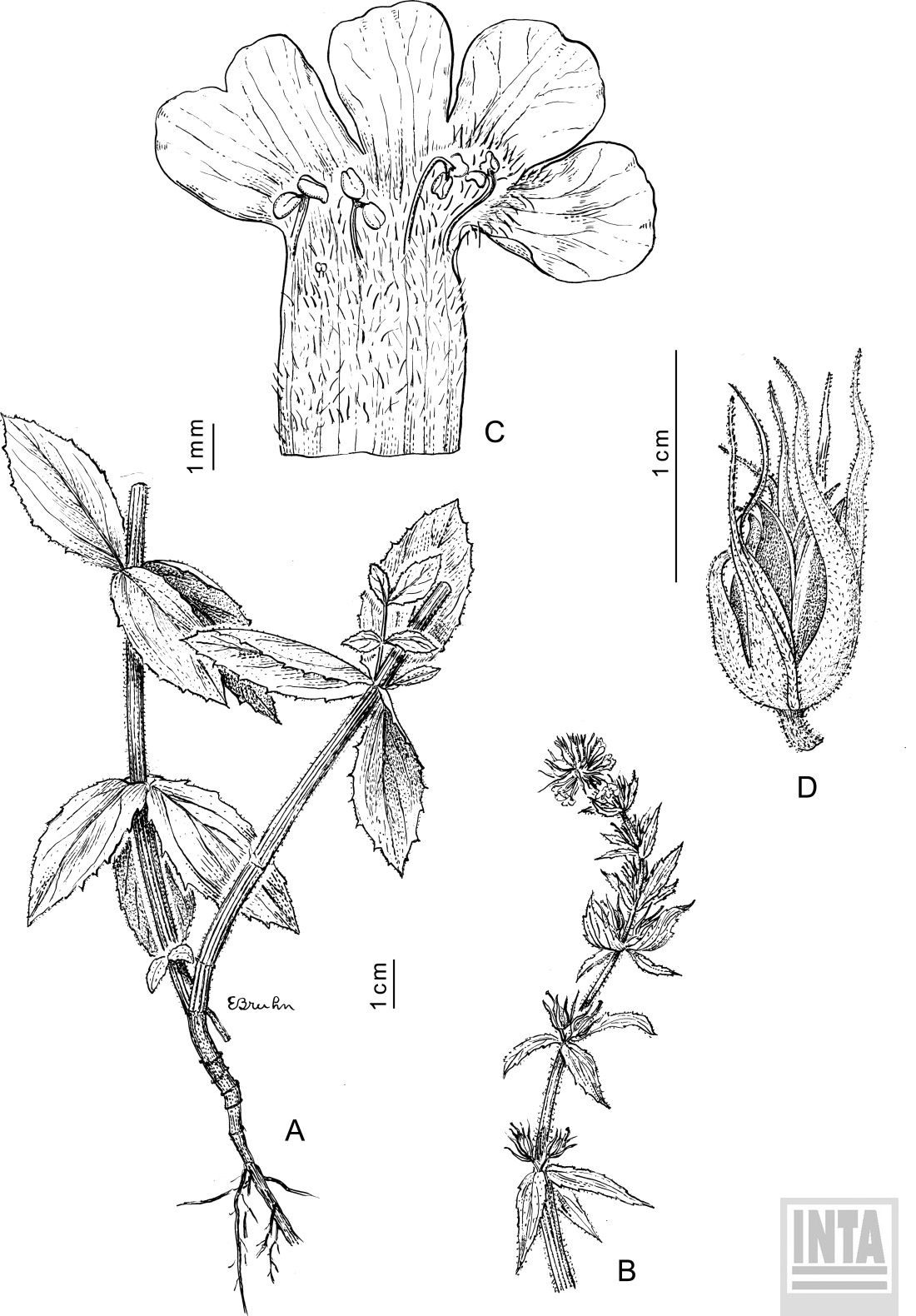 Sufrútice erecto, rizomatoso, de 30-70 cm de alto, glandular-pubescente. Tallos con costillas levemente marcadas, con tricomas glandulares pedicelados pluricelulares, uniseriados, y tricomas eglandulares. Hojas basales opuestas, en la parte superior verticiladas, 2-3 por nudo, sésiles, lanceoladas a oblanceoladas, de 40-80 × 5-18 mm, base auriculada, margen serrado, pubescentes. Inflorescencia espiciforme, brácteas florales lanceoladas, de 20 mm de largo con ápice curvado hacia afuera, flores subsésiles, con pedicelos cortos, de 1-2 mm de largo; 2 bractéolas linear lanceoladas de 5 mm de largo. Cáliz con 5 sépalos iguales, oblongo-lanceolados, de 5 mm de largo, glandular-pubescentes. Corola violácea a lilácea, bilabiada, 12-16 mm de largo, glanduloso-pubescente por fuera y con tricomas largos en la garganta; estambres 4, 2 filamentos breves de 4 mm de largo y 2 mayores de 5 mm de largo; anteras separadas por conectivos ovoides; ovario ovoide, estilo recto, 5 mm, estigma lateralmente achatado. Cápsula ovoide, de 4-5 mm de largo, 4-valvar. Semillas elipsoides.