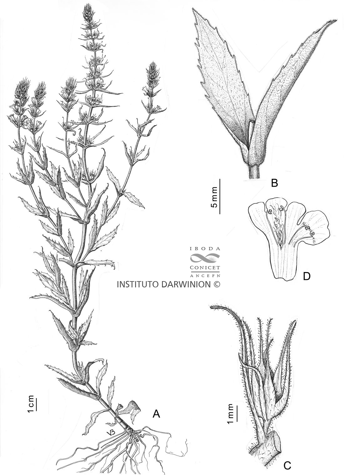 Sufrútice erecto, rizomatoso, de 30-70 cm de alto, glandular-pubescente. Tallos con costillas levemente marcadas, con tricomas glandulares pedicelados pluricelulares, uniseriados, y tricomas eglandulares. Hojas basales opuestas, en la parte superior verticiladas, 2-3 por nudo, sésiles, lanceoladas a oblanceoladas, de 40-80 × 5-18 mm, base auriculada, margen serrado, pubescentes. Inflorescencia espiciforme, brácteas florales lanceoladas, de 20 mm de largo con ápice curvado hacia afuera, flores subsésiles, con pedicelos cortos, de 1-2 mm de largo; 2 bractéolas linear lanceoladas de 5 mm de largo. Cáliz con 5 sépalos iguales, oblongo-lanceolados, de 5 mm de largo, glandular-pubescentes. Corola violácea a lilácea, bilabiada, 12-16 mm de largo, glanduloso-pubescente por fuera y con tricomas largos en la garganta; estambres 4, 2 filamentos breves de 4 mm de largo y 2 mayores de 5 mm de largo; anteras separadas por conectivos ovoides; ovario ovoide, estilo recto, 5 mm, estigma lateralmente achatado. Cápsula ovoide, de 4-5 mm de largo, 4-valvar. Semillas elipsoides.