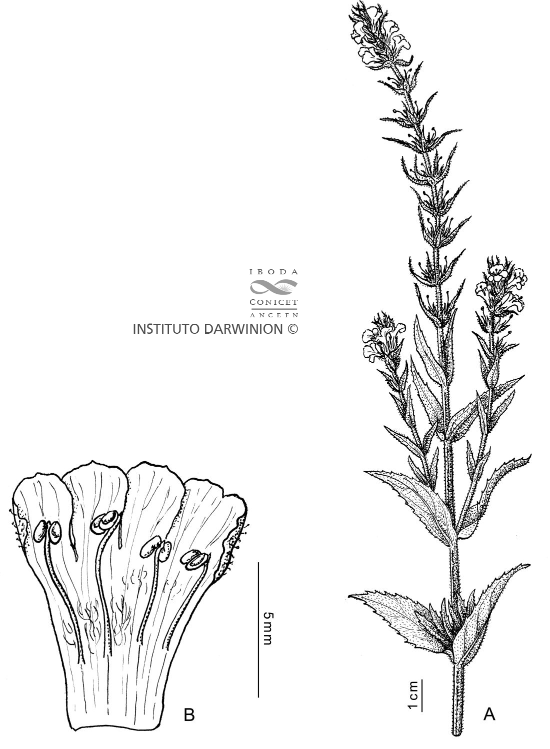 Sufrútice erecto, rizomatoso, de 30-70 cm de alto, glandular-pubescente. Tallos con costillas levemente marcadas, con tricomas glandulares pedicelados pluricelulares, uniseriados, y tricomas eglandulares. Hojas basales opuestas, en la parte superior verticiladas, 2-3 por nudo, sésiles, lanceoladas a oblanceoladas, de 40-80 × 5-18 mm, base auriculada, margen serrado, pubescentes. Inflorescencia espiciforme, brácteas florales lanceoladas, de 20 mm de largo con ápice curvado hacia afuera, flores subsésiles, con pedicelos cortos, de 1-2 mm de largo; 2 bractéolas linear lanceoladas de 5 mm de largo. Cáliz con 5 sépalos iguales, oblongo-lanceolados, de 5 mm de largo, glandular-pubescentes. Corola violácea a lilácea, bilabiada, 12-16 mm de largo, glanduloso-pubescente por fuera y con tricomas largos en la garganta; estambres 4, 2 filamentos breves de 4 mm de largo y 2 mayores de 5 mm de largo; anteras separadas por conectivos ovoides; ovario ovoide, estilo recto, 5 mm, estigma lateralmente achatado. Cápsula ovoide, de 4-5 mm de largo, 4-valvar. Semillas elipsoides.