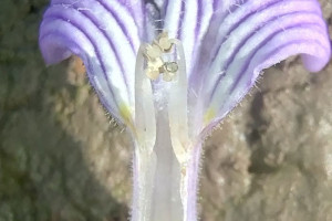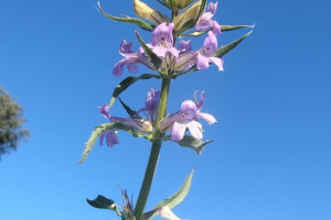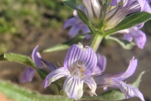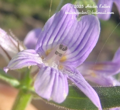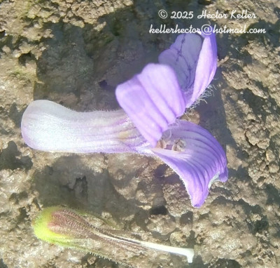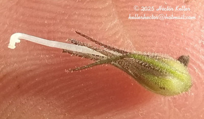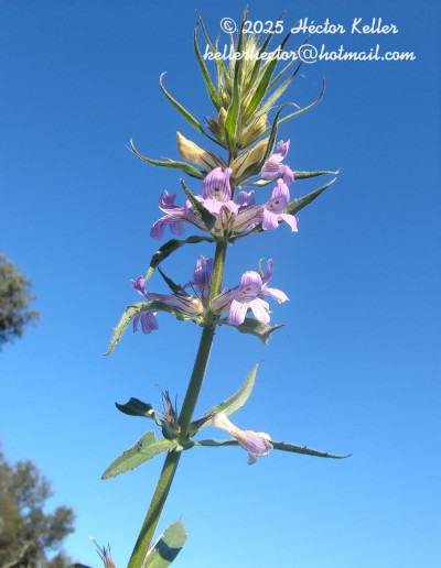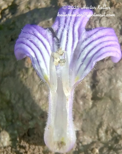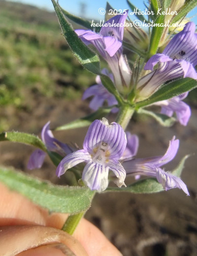 Hierba estolonífera, 25 a 50 cm de alto, cubierta de brevísimos tricomas glandulares pedicelados unicelulares. Tallos con cuatro costillas marcadas. Hojas opuestas, sésiles, linear-lanceoladas, 60 × 4 mm, base atenuada, margen subentero, apenas denticulado, con puntos glandulosos, glabras. Inflorescencias espiciformes terminales, brácteas florales linear-lanceoladas de 10 mm de largo, flores sésiles; con 2 bractéolas, linear-lanceoladas, de 3-4 mm de largo. Cáliz con 5 sépalos iguales, lanceolados, de 4-5 mm, glandular-pubescentes. Corola violácea a lilácea, bilabiada, de 8-10 mm de largo, pubescente, el interior con tricomas largos, garganta blanquecina; estambres 4, 2 filamentos breves de 2 mm de largo y 2 mayores de 4 mm de largo; anteras con tecas subiguales, separadas por conectivo bibraqueado; ovario ovoide, estilo curvado, de 4 mm de largo, estigma bilamelado con sus bordes papilosos Cápsula ovoide, de 3 mm de largo, 4-valvada con ápice erecto. Semillas ovoides, estipitadas.
