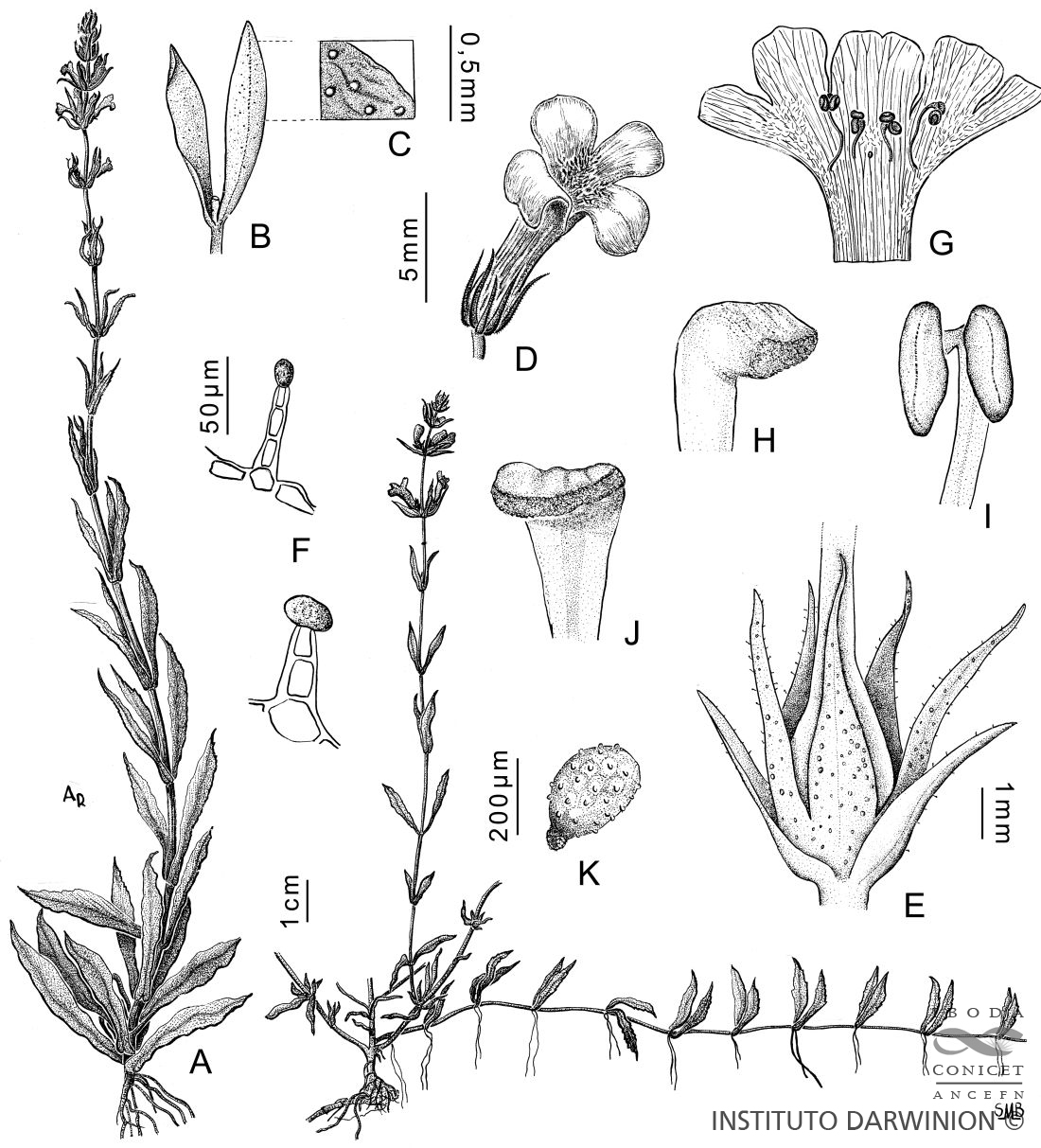 Hierba estolonífera, 25 a 50 cm de alto, cubierta de brevísimos tricomas glandulares pedicelados unicelulares. Tallos con cuatro costillas marcadas. Hojas opuestas, sésiles, linear-lanceoladas, 60 × 4 mm, base atenuada, margen subentero, apenas denticulado, con puntos glandulosos, glabras. Inflorescencias espiciformes terminales, brácteas florales linear-lanceoladas de 10 mm de largo, flores sésiles; con 2 bractéolas, linear-lanceoladas, de 3-4 mm de largo. Cáliz con 5 sépalos iguales, lanceolados, de 4-5 mm, glandular-pubescentes. Corola violácea a lilácea, bilabiada, de 8-10 mm de largo, pubescente, el interior con tricomas largos, garganta blanquecina; estambres 4, 2 filamentos breves de 2 mm de largo y 2 mayores de 4 mm de largo; anteras con tecas subiguales, separadas por conectivo bibraqueado; ovario ovoide, estilo curvado, de 4 mm de largo, estigma bilamelado con sus bordes papilosos Cápsula ovoide, de 3 mm de largo, 4-valvada con ápice erecto. Semillas ovoides, estipitadas.