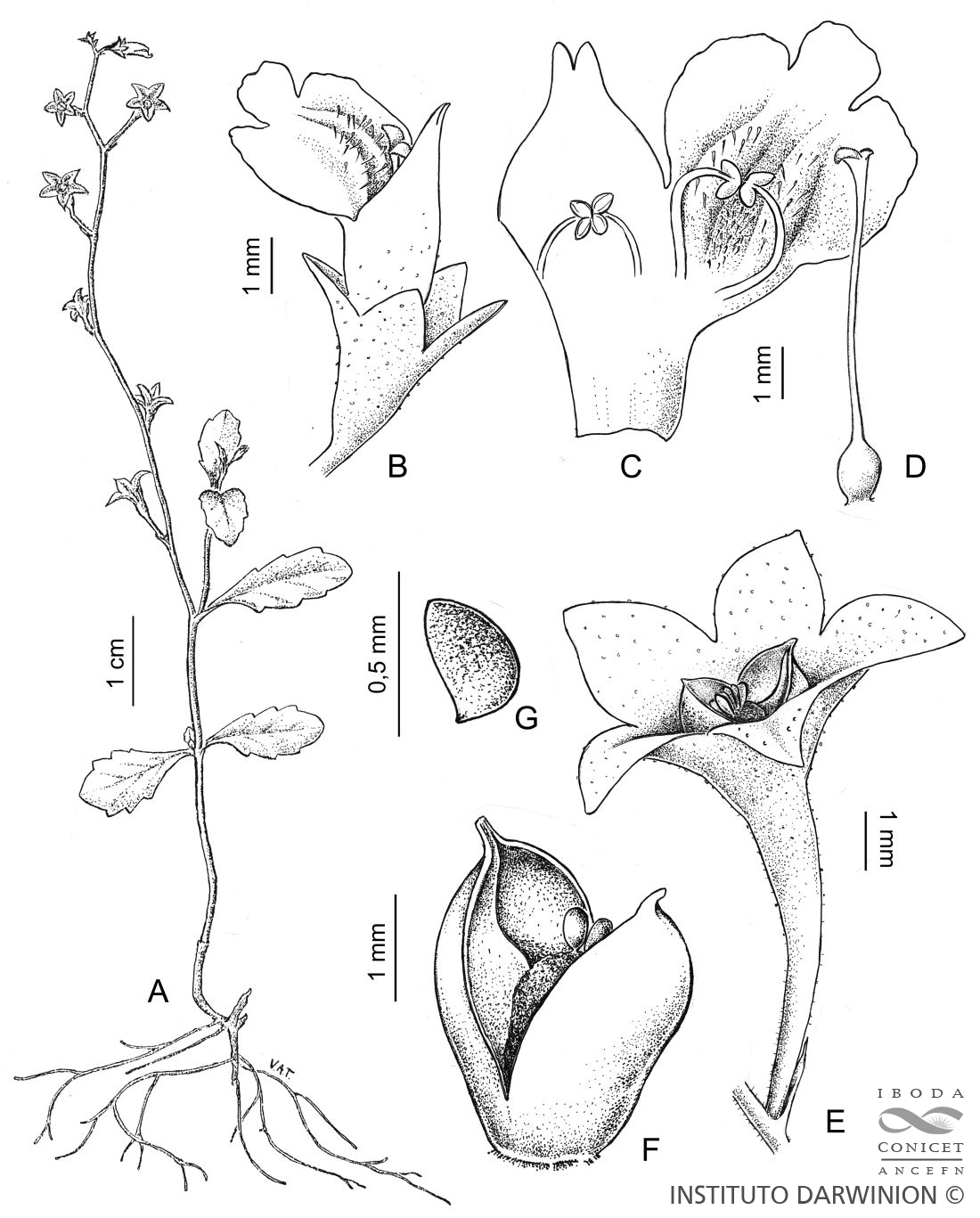 Hierbas de 8-11 cm de alto. Hojas de 10-15 × 5-7 mm. Inflorescencias de 3-6 cm de largo. Flores con pedicelos de 2-7 mm de largo, engrosados en la fructificación; brácteas de 0,5-2 mm de largo; cáliz de 3,5 mm de largo, con lóbulos de 2 mm de largo; corola de 9 mm de largo, celeste pálido por fuera y blanca por dentro, con algunas máculas amarillas y rojizas sobre las abolladuras del labio inferior. Fruto de 3 × 2-2,5 mm. Semillas de 0,4 mm de largo.