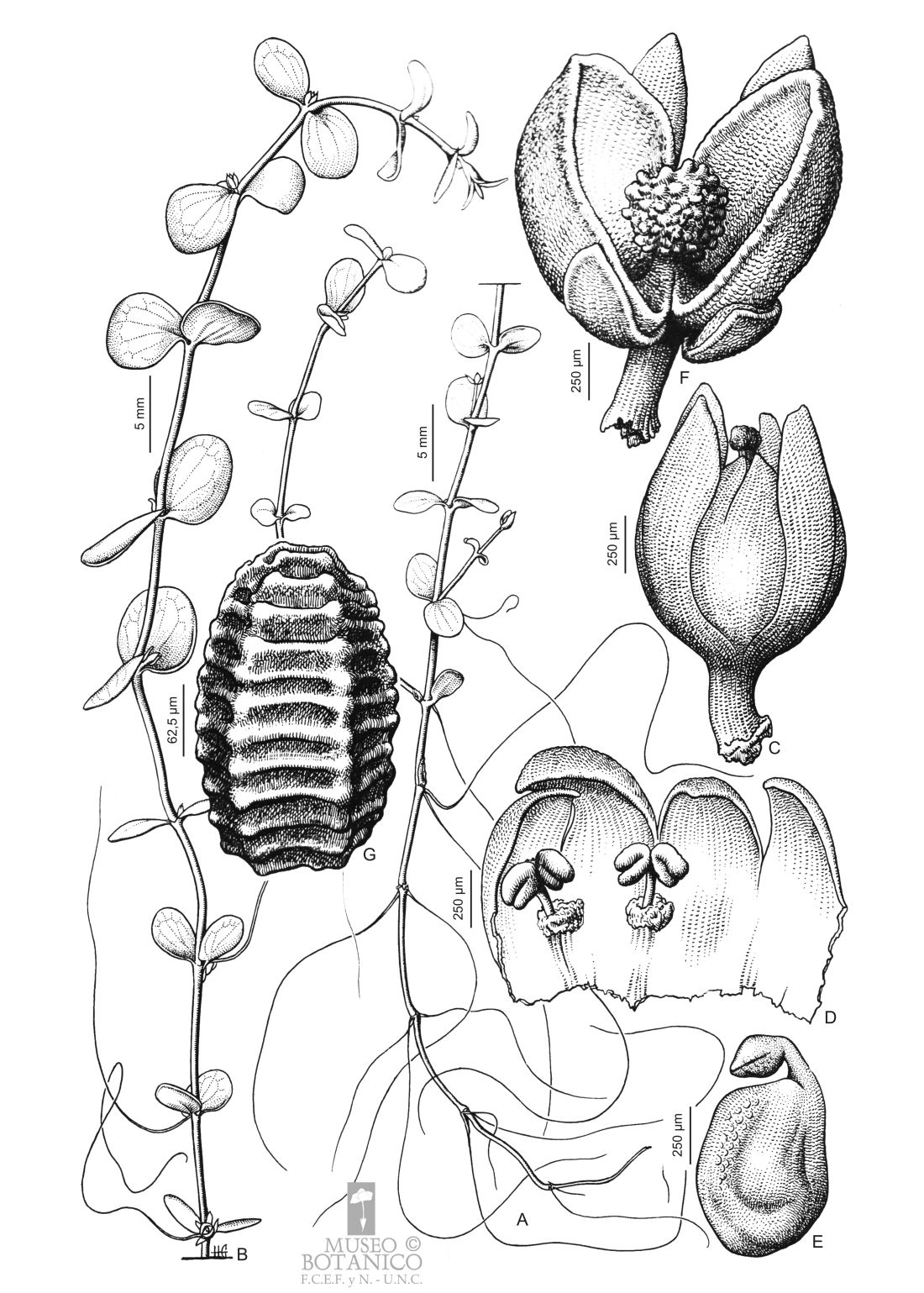 A. Porción basal de la planta. B. Porción apical de la planta. C. Flor, vista lateral. D. Corola desplegada. E. Gineceo. F. Fruto dehiscente.
