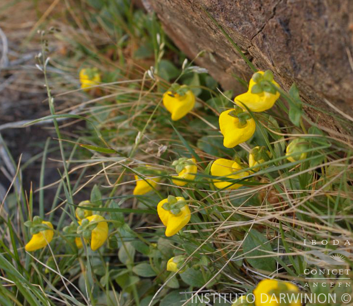 Hierba perenne, rosulada, que forma cojines gráciles y laxos, rizoma subterráneo con raíces fasciculadas; parte inferior de los tallos muy ramificados, desnudos y sin hojas. Hojas lanceoladas a oblongas, de tamaño variable siendo las mayores de unos 6 × 11 cm; ambas caras de la lámina menudamente pilosa, con pelos largos sobre las nervaduras en la cara abaxial; lámina atenuada en un pecíolo rojizo y piloso en los márgenes. Flores solitarias o en dicasios sobre pedúnculos largos de unos 7 cm de largo cubiertos por pelos largos y blancos frecuentemente terminados en una cabezuela glandular, dispuestos perpendiculares al eje; cáliz con lóbulos ovados u oblongos de 4-5 × 2,5-4 mm (acrescente en el fruto), densamente híspidos externamente y cortamente pubescentes en su cara interna; corola amarilla; labio superior de la corola cuculado, adpreso lateralmente, glanduloso, especialmente en su extremo anterior; labio inferior de 1-1,5 cm de largo, orbicular con los flancos más elevados, garganta pequeña, cortamente trapezoidal, con borde distal muy curvo; apéndice muy prolongado, en ángulo de 90° respecto al labio inferior, elaióforo denso, bien delimitado en forma de silla de montar, en el extremo distal del apéndice; filamentos de los estambres ca. 1 mm de largo, con pelos muy cortos y anteras oblongas, de 3 mm de largo, contiguas; tecas divaricadas, subiguales, levemente dehiscentes hacia abajo; ovario piriforme, glanduloso de 3,3 mm de largo, estilo que sobrepasa a los estambres, levemente curvado hacia abajo. Cápsula piriforme, de 1 cm de largo, con valvas atenuadas hacia el ápice. Semillas de 0,5-0,7 mm de largo.