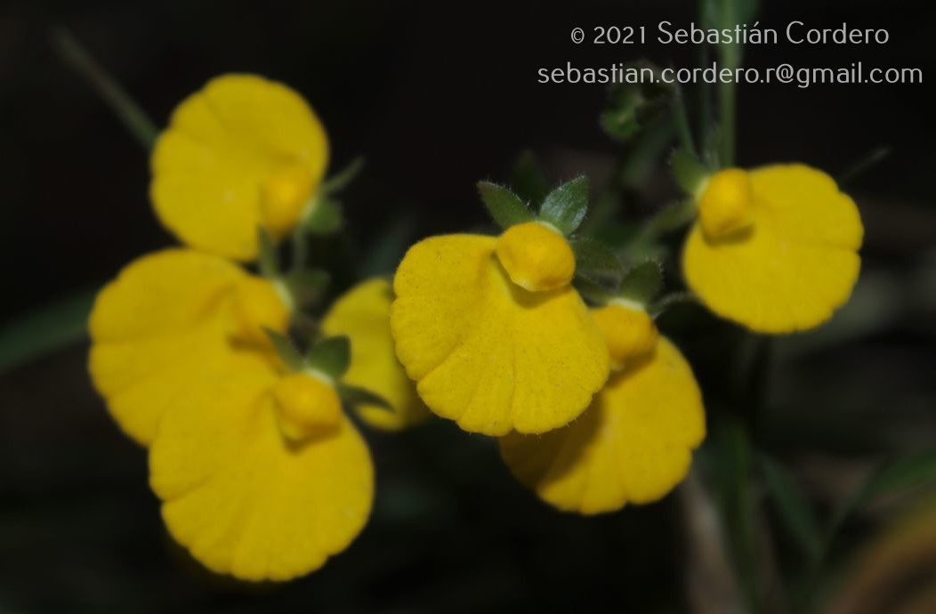 Planta rosulada, rizomatosa, formando matas. Hojas elípticas hasta anchamente ovadas, de 6-12 × 3-7 cm, ápice redondeado a levemente aguzado, base de la lámina atenuada en un pecíolo carnoso y corto; margen leve e irregularmente aserrado; nervaduras de la cara adaxial hundidas, en la abaxial prominentes; pelos cortos dispersos en ambas caras, la adaxial con pelos cortos y laxamente dispuestos, con margen muy ciliado, o densamente lanosa, con pelos simples pardos dispuestos hasta el margen; cara abaxial con pelos simples, largos y dispersos, sobre todo sobre las nervaduras. Inflorescencias cimosas multifloras, hasta con 34 flores por escapo, éste puede llegar hasta 70 cm de alto, pedicelos de 2.5 cm de largo. Sépalos ovados, de 3,7 × 2,8 mm, cara adaxial con pelos glandulares cortos y dispersos, cara abaxial más densamente glandular con pocos pelos simples largos y rojizos dispersos en la base; corola de color amarillo brillante, labio superior cuculado, corto y ancho, redondeado, de 4 × 6 mm; labio inferior sacciforme, muy deprimido, dispuesto horizontalmente, ovado-triangular de 12-16 × 16-19 mm, angostamente elíptico en vista lateral, garganta muy pequeña, redondeada, oculta por el labio superior; apéndice plegado en ángulo recto en el interior del labio inferior, de 2 × 5,5 mm; elaióforo densamente glandular, bien delimitado, rectangular, cubriendo casi por completo el apéndice; filamentos de los estambres de 2,2 mm de largo, orientados hacia arriba formando un ángulo de ± 70° con el estilo que es horizontal; tecas divaricadas, orientadas hacia arriba cubiertas por el labio superior; ovario muy piloso con pelos glandulares y simples largos. Cápsula anchamente ovoide, de 7 × 4,7 mm, laxamente glandular. Semillas alargadas a globosas, de 0,72 × 0,38 mm, pardo claras.