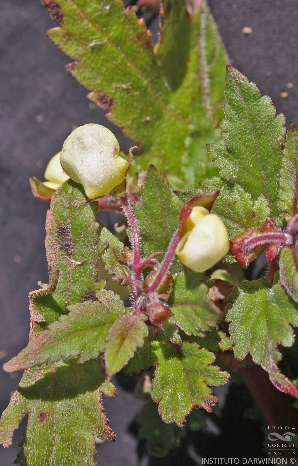 Hierba palustre, con tallos crasos de 50 cm de largo, de color verde claro y púrpura a nivel de los nudos, radicantes en su parte inferior, poco ramificados, laxamente pubescentes o glabros, con entrenudos de 4-10 cm de largo.Hojasovadas, láminas de 4-12×3,5–8,8 cm, agudas o acuminadas en el ápice y cuneadas a truncadas en la base, lobadas con 2-5 pares de lóbulos laterales lanceolados de margen notablemente doble aserrado, glabras en ambas caras o con pelitos cortos en el margen, pecioladas, con pecíolo plano hasta de 5 cm de largo, apenas alados, connados en los nudos. Flores numerosas, en cimas terminales laxas; sépalos ovados, agudos o acuminados laxamente pilosos en la cara abaxial y glandular-pubérulos en la adaxial, de color verde claro y márgenes púrpura, irregularmente dentados (raramente enteros), de 5,2-9,6 × 3,6-7,8 mm, el inferior más estrecho; corola de color amarillo pálido sin máculas; labio superior cuculado, ápice estrechado sobre las piezas fértiles, de 2-4 × 3-6 mm; labio inferior sacciforme de 13-20 × 7-15 mm, geniculado, estrechado en su base, con garganta incurvada, pilosa; apéndice plegado en ángulo recto al interior del labio inferior de 1,5 × 3 mm; elaióforo trapezoidal ocupando el extremo distal del apéndice de 0,75 × 2,5 mm; estambres con filamentos breves de 0,5-1,5 mm de largo; tecas desiguales, ambas fértiles, la inferior muy reducida, conectivo desarrollado de unos 4 mm de largo que separa a las tecas, recto; ovario semiínfero de 6,5 mm de largo, glanduloso-pubérulo. Cápsula subglobosa, de 5-8 mm de largo, en general de menor longitud que el cáliz, laxamente glanduloso-pubérulo. Semillas numerosas de 0,6 mm de largo, pardo-rojizas.