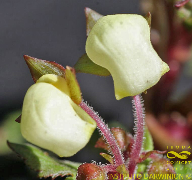 Hierba palustre, con tallos crasos de 50 cm de largo, de color verde claro y púrpura a nivel de los nudos, radicantes en su parte inferior, poco ramificados, laxamente pubescentes o glabros, con entrenudos de 4-10 cm de largo.Hojasovadas, láminas de 4-12×3,5–8,8 cm, agudas o acuminadas en el ápice y cuneadas a truncadas en la base, lobadas con 2-5 pares de lóbulos laterales lanceolados de margen notablemente doble aserrado, glabras en ambas caras o con pelitos cortos en el margen, pecioladas, con pecíolo plano hasta de 5 cm de largo, apenas alados, connados en los nudos. Flores numerosas, en cimas terminales laxas; sépalos ovados, agudos o acuminados laxamente pilosos en la cara abaxial y glandular-pubérulos en la adaxial, de color verde claro y márgenes púrpura, irregularmente dentados (raramente enteros), de 5,2-9,6 × 3,6-7,8 mm, el inferior más estrecho; corola de color amarillo pálido sin máculas; labio superior cuculado, ápice estrechado sobre las piezas fértiles, de 2-4 × 3-6 mm; labio inferior sacciforme de 13-20 × 7-15 mm, geniculado, estrechado en su base, con garganta incurvada, pilosa; apéndice plegado en ángulo recto al interior del labio inferior de 1,5 × 3 mm; elaióforo trapezoidal ocupando el extremo distal del apéndice de 0,75 × 2,5 mm; estambres con filamentos breves de 0,5-1,5 mm de largo; tecas desiguales, ambas fértiles, la inferior muy reducida, conectivo desarrollado de unos 4 mm de largo que separa a las tecas, recto; ovario semiínfero de 6,5 mm de largo, glanduloso-pubérulo. Cápsula subglobosa, de 5-8 mm de largo, en general de menor longitud que el cáliz, laxamente glanduloso-pubérulo. Semillas numerosas de 0,6 mm de largo, pardo-rojizas.