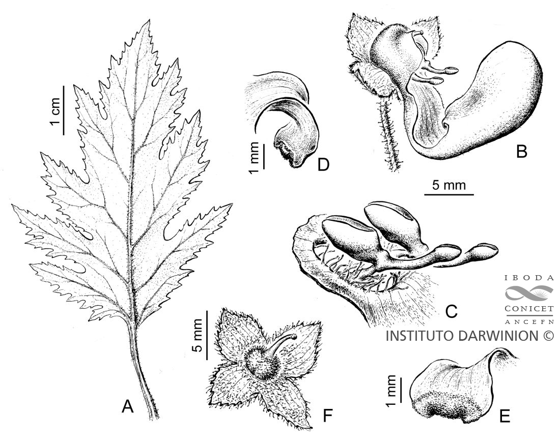 A. Hoja. B. Flor. C. Labio superior con androceo. D-E. Elaióforo. F. Cáliz y gineceo.