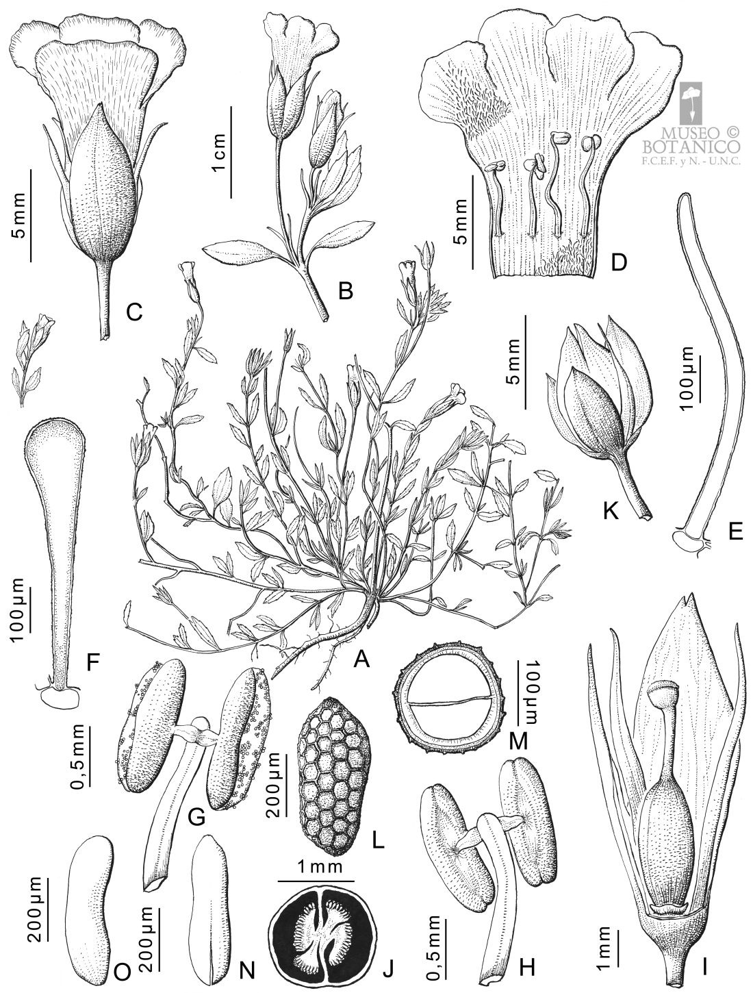 A. Planta. B. Detalle de rama florífera. C. Flor. D. Corola desplegada. E. Tricoma del sector basal del tubo corolino. F. Fruto. G-H. Antera, vista dorsal y ventral, respectivamente. I. Gineceo y cáliz (obsérvese los sépalos desiguales). J. Transcorte por ovario. K. Fruto. L. Semilla. M. Transcorte por semilla. N. Embrión (de A. T. Hunziker 10316, CORD).