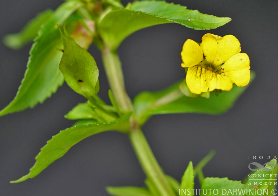 Hierbas de 20-60 cm de alto, glabras. Tallos robustos, de 3- 5 mm de diámetro, cuadrangulares o con costillas, ascendentes o erguidos. Hojas opuestas, subsésiles, láminas ovadas a elípticas, de 20-60 × 7-20 mm, base atenuada, ápice agudo, aserradas, membranáceas. Flores 1 o 2 por nudo; pedicelos de 11- 30 mm de largo; bractéolas lineares, enteras, de 7-11 × 1 mm. Cáliz con sépalo dorsal ovado, de 11-15 × 6,5-8 mm; sépalos ventrales ovados, de 11-13 × 6-7 mm; sépalos internos linear-lanceolados de 10-12 × 1-2 mm, glabros. Corola de 12-15 mm de largo, poco mayor que el cáliz, amarilla, limbo ca. 15 mm de diámetro, labio posterior con pelos claviformes en la cara interna, amarilla, con nervaduras castañas. Estambres laterales con filamentos de 4- 5 mm de largo; estambres ventrales con filamentos de 6-7 mm de largo; anteras elipsoides, de 0,5-0,8 mm de largo. Ovario elipsoide, ca. 3,5 mm de largo; estilo de 1-2 mm de largo. Cápsulas elipsoides, de 5-10 × 5 mm, con cáliz acrescente.