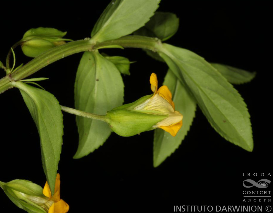 Hierbas de 20-60 cm de alto, glabras. Tallos robustos, de 3- 5 mm de diámetro, cuadrangulares o con costillas, ascendentes o erguidos. Hojas opuestas, subsésiles, láminas ovadas a elípticas, de 20-60 × 7-20 mm, base atenuada, ápice agudo, aserradas, membranáceas. Flores 1 o 2 por nudo; pedicelos de 11- 30 mm de largo; bractéolas lineares, enteras, de 7-11 × 1 mm. Cáliz con sépalo dorsal ovado, de 11-15 × 6,5-8 mm; sépalos ventrales ovados, de 11-13 × 6-7 mm; sépalos internos linear-lanceolados de 10-12 × 1-2 mm, glabros. Corola de 12-15 mm de largo, poco mayor que el cáliz, amarilla, limbo ca. 15 mm de diámetro, labio posterior con pelos claviformes en la cara interna, amarilla, con nervaduras castañas. Estambres laterales con filamentos de 4- 5 mm de largo; estambres ventrales con filamentos de 6-7 mm de largo; anteras elipsoides, de 0,5-0,8 mm de largo. Ovario elipsoide, ca. 3,5 mm de largo; estilo de 1-2 mm de largo. Cápsulas elipsoides, de 5-10 × 5 mm, con cáliz acrescente.