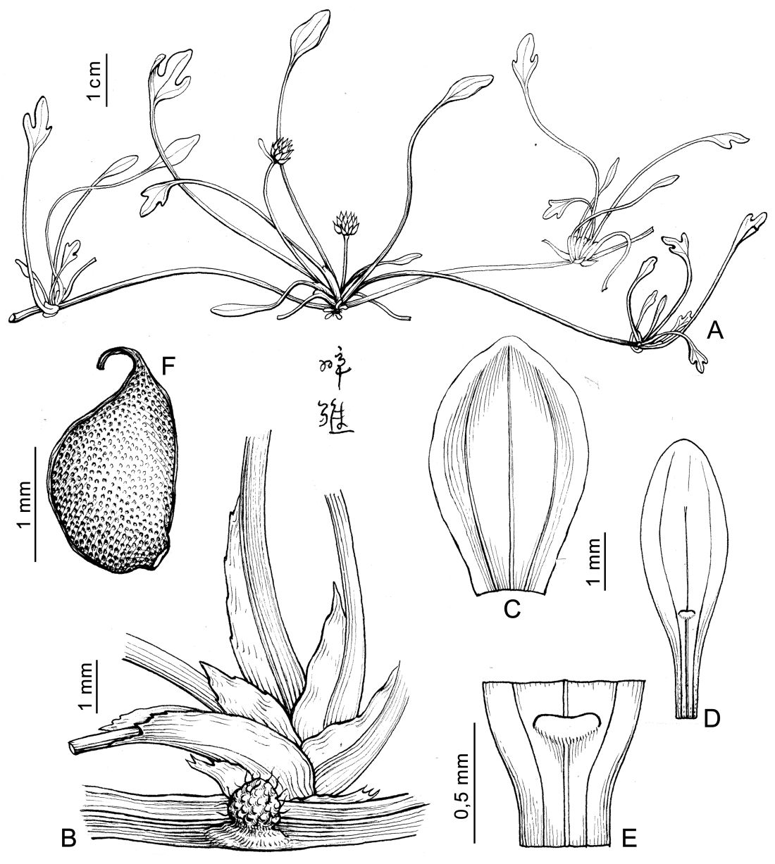 Hierbas hasta de 30 cm de alto, glabras; tallos rastreros, radicantes. Hojas con pecíolos hasta de 24 cm de largo cuando crecen sumergidas; vaina estipular subamplexicaule, de bordes escariosos; lámina linear-oblonga a ovada u obovada, de 3-34 × 0,7-37 mm, entera, 3-lobada o profundamente 3-partida, a veces los segmentos laterales a su vez lobulados, base cuneada o truncada. Flores solitarias o en cimas 2-3-fl oras, axilares, sésiles o rara vez con pedúnculos hasta de 1 cm de largo; sépalos 3-4, ovados, de 3-5 × 2-3,5 mm; pétalos 3, linear-subespatulados, de 3-5 × 0,7-2,5 mm, amarillos; escama nectarífera en forma de bolsillo; estambres 5-13; carpelos 25-65, ovoides, estilo delgado, algo curvo; receptáculo subesférico, subcónico, glabro. Frutos aquenios ovoides, de 1 mm de diámetro, comprimidos, marginados, cortamente apiculados.