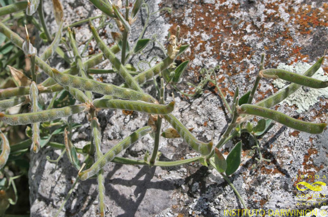 Planta de ± I m alt. perenne, rizo matosa, verde cuando seca. Tallos gruesos-, alados-. Hojas 1-yugadas; pecíolos de 8-25 mm; estípulas de 5-25 x 3-15 mm, semisagitadas. acu¬minadas, pubescentes en ambas caras, pero más en la abaxial, lóbulo agudo; folíolos-de 20-78 x 5-22. mm, lanceolados a anchamente lanceolados, mucronados; zarcillos simples a 3-5-fidos, excepcional mente 4-6-fidos, generalmente mucho más largos que los folío¬los. Racimos 5-I5-floro&.. Fiares de 15-23 mm, ebracteadas, azules o violáceas, pedicelos de 2-4 mm. Cáliz de 6-13 mm, pubescente, diente inferior de 3-7 mm, los superiores 1/2 ó 1/3 más breves. Vexilo de 15-22. x 11-ZQ mm, suborbicular, emarginado; limbo de las alas de 9-13 x 5-11 mm, ovado, papiloso. Androceo diadelfo o seudomonadelfo; co¬lumna estaminal recta en el ápice. Ovario de 9-12 mm, muy pubescente; estile dé 4-6 mm; estigma doble. Legumbre de 55-75 x 3-6 mm, castaña, cubierta de pelos cortos ± patentes^ interiormente con disepimerrtos celulares incompletos, esponjosos-, entre las semillas. Semillas de 3-5 mm, globosas a comprimidas, castañas o negruzcas; hilo de 1,3-1,5 mm.