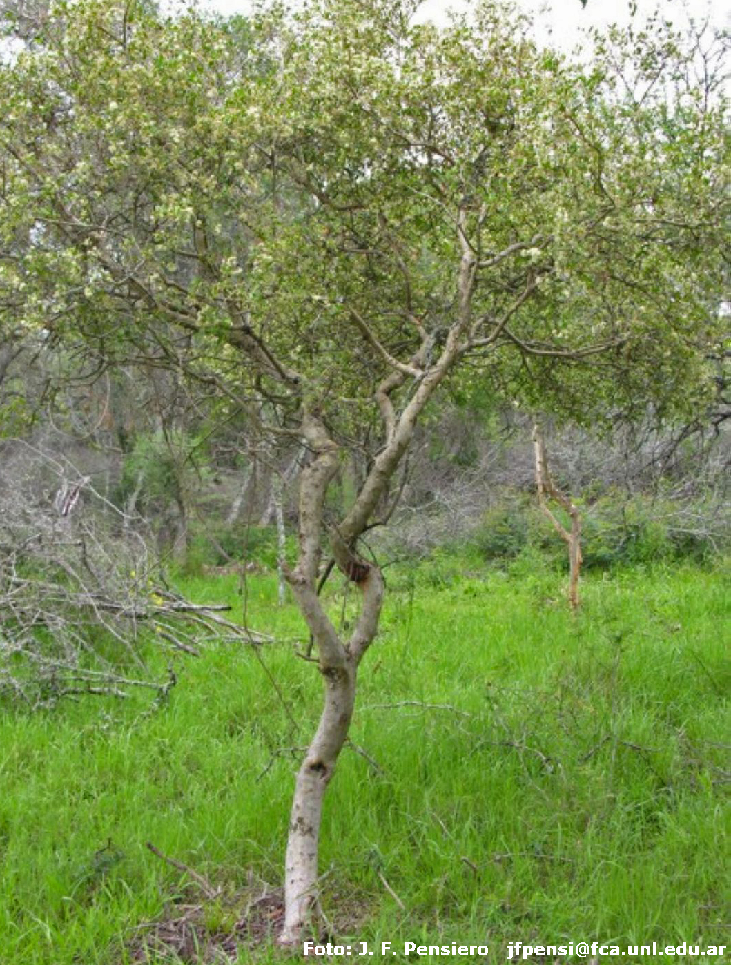 Árbol o arbusto de 2-7 m. Hojas de 2,2-5,5 x 0,5-1,8 cm, angostamente ovadas, elípticas o angostamente elípticas, glabras. Flores en dicasios (1) 3-7-floros; hipanto glabro; sépalos seríceo-pubescentes en su cara interna; pétalos pubescentes en su cara interna; estambres de 3-5 mm; disco pubérulo; estilo de 4-5 mm. Fruto hasta 7 mm, globoso. 2n = 22 (L. M. Bernardello et al., Bol. Soc. Argent. Bot. 26, 3-4: 151, f. 1, H. 1990). [Árbol o arbusto de 2-7 m de altura, con corteza exfoliante, clara, lisa; tallos jóvenes y botones foliares pilosos. Hojas de lámina papiráceo-cartácea, glabra, algo discolor, ovado angosta, elíptica o elíptico angosta, aguda, brevemente apiculada, de base obtusa, 2,2-5,5 cm long. x 0,5-1,8 cm lat.; pecíolo glabro, 2-5 mm long. Flores en dicasios (1-)3- 7-floros. Bractéolas glabras, elípticas, angostas, 1-3 mm long. Hipanto glabro. Sépalos (4-)5, desiguales, con la cara interna seríceo-pubescente y la externa glabra, ciliolados, dos menores agudos, 1-1,5 mm long., y tres de ápice obtuso, 2-3 mm long. Pétalos ciliolados, 5, desiguales, pubescentes en la mitad superior de la cara interna, 2,5-5 mm long. Estambres hasta 5 mm long.; disco estaminal pubérulo. Estilo glabro, ca. 5 mm long. Baya globosa, negro-violácea, ca. 7 mm de diámetro.]
