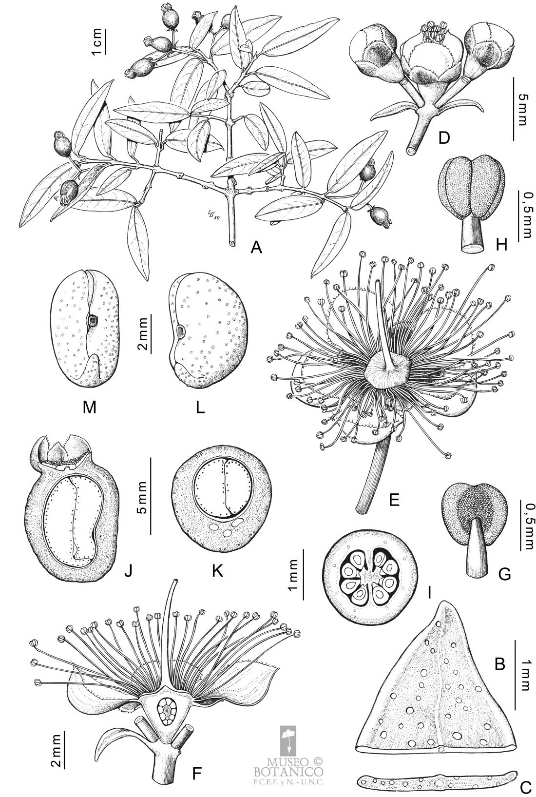 Árbol o arbusto de 2-7 m. Hojas de 2,2-5,5 x 0,5-1,8 cm, angostamente ovadas, elípticas o angostamente elípticas, glabras. Flores en dicasios (1) 3-7-floros; hipanto glabro; sépalos seríceo-pubescentes en su cara interna; pétalos pubescentes en su cara interna; estambres de 3-5 mm; disco pubérulo; estilo de 4-5 mm. Fruto hasta 7 mm, globoso. 2n = 22 (L. M. Bernardello et al., Bol. Soc. Argent. Bot. 26, 3-4: 151, f. 1, H. 1990). [Árbol o arbusto de 2-7 m de altura, con corteza exfoliante, clara, lisa; tallos jóvenes y botones foliares pilosos. Hojas de lámina papiráceo-cartácea, glabra, algo discolor, ovado angosta, elíptica o elíptico angosta, aguda, brevemente apiculada, de base obtusa, 2,2-5,5 cm long. x 0,5-1,8 cm lat.; pecíolo glabro, 2-5 mm long. Flores en dicasios (1-)3- 7-floros. Bractéolas glabras, elípticas, angostas, 1-3 mm long. Hipanto glabro. Sépalos (4-)5, desiguales, con la cara interna seríceo-pubescente y la externa glabra, ciliolados, dos menores agudos, 1-1,5 mm long., y tres de ápice obtuso, 2-3 mm long. Pétalos ciliolados, 5, desiguales, pubescentes en la mitad superior de la cara interna, 2,5-5 mm long. Estambres hasta 5 mm long.; disco estaminal pubérulo. Estilo glabro, ca. 5 mm long. Baya globosa, negro-violácea, ca. 7 mm de diámetro.]