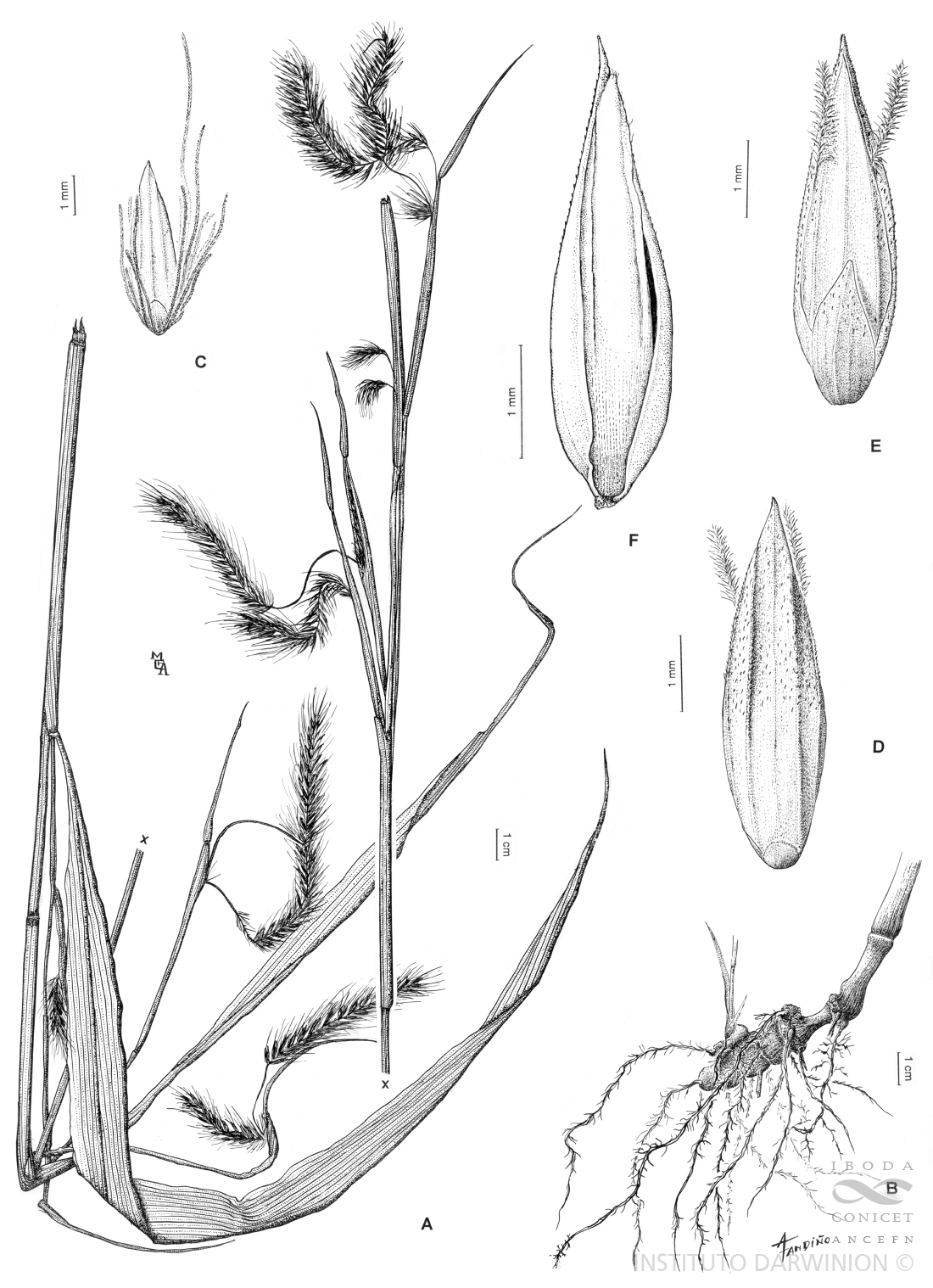 A. Planta. B. Rizoma. C. Espiguilla con involucro. D. Espiguilla vista dorsal. E. Espiguilla vista ventral. F. Antecio superior vista ventral.