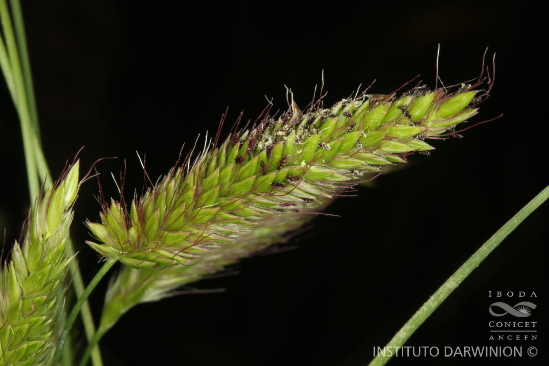 Plantas perennes, cespitosas, con rizomas cortamente tuberculiformes, cubiertos de vainas muertas; cañas herbáceas, ± robustas, huecas, de 1-3 m de alto y 5-15 mm de diámetro, levemente comprimidas, no ramificadas desde la base, con los entrenudos glabros y los nudos barbados excepcionalmente híspidos, formados por un anillo de pelos caducos, de 1-2 mm de largo; vainas glabras, hendidas, con margen membranáceo a veces ciliado, sin yema en su axila; lígulas pestañosas, formadas por un anillo de pelos cortos de 1,5-3 mm de largo; láminas planas, anchas, lanceoladas, de 12-35 x 1,5-3,5 cm, glabras o hirsutas, estrechadas en la base y de ápice agudo, nervio medio conspicuo. Inflorescencia con panojas espiciformes axilares y terminales dispuestas en forma alterna sobre un mismo eje, densas, exertas, castaño-pajizas, por lo general rectas, menos frecuentemente flexuosas, de 4-8 x 1-2 cm considerando las setas (0,7-1 cm de ancho excluyendo las setas); pedúnculos cilíndricos, filiformes, hasta de 10 cm de largo, exertos, rectos o algo curvos; raquis de la panoja tenue, longitudinalmente acanalado, pubescente, no dispuesto en zig-zag; involucro formado por (13-)15-40 setas lineal-escabrosas, desiguales en largo (aprox. ? son menores o iguales que la espiguilla y ? o menos son levemente mayores), de 3-8 mm de largo y una sola seta lineal-escabrosa, notablemente más larga que las restantes, de 8-15 mm de largo. Espiguillas lanceoladas, solitarias por involucro, muy caedizas, de (4-)4,5-6,5(-7) x 1-1,5 mm, subsésiles o cortamente pediceladas, glabras o escabrosas, 2-floras, con el antecio inferior generalmente neutro y el superior perfecto, base de la espiguilla con anillo de pelos; gluma inferior aguda, hialina, muy pequeña, de 0,3-1 mm de largo, enervia o 1-nervia, de ápice agudo o redondeado; gluma superior membranácea, de 1-2,5 mm de largo, 1-3-nervia, de ápice agudo u obtuso; lemma inferior subulada, escabroso-pubescente hacia el ápice, levemente mayor que el antecio fértil, de (3,8-)4-5,5(-5,8) x 1-1,5 mm, 5(-7)-nervia, de ápice agudo; pálea inferior ausente; lemma superior lanceolada, glabra, de (3,5-)3,8-4,5(-5) x 1-1,5 mm, 5-nervia, las nervaduras difusas, de ápice agudo; pálea superior levemente menor que la lemma, de (3-)3,5-4,5 mm de largo; estambres 3, anteras de 1-2 mm de largo, de ápice glabro, con los filamentos estaminales rara vez exertos; gineceo con las ramas estigmáticas exertas, de 1-2 mm de largo, estilos apenas soldados en la base; cariopsis no vista.