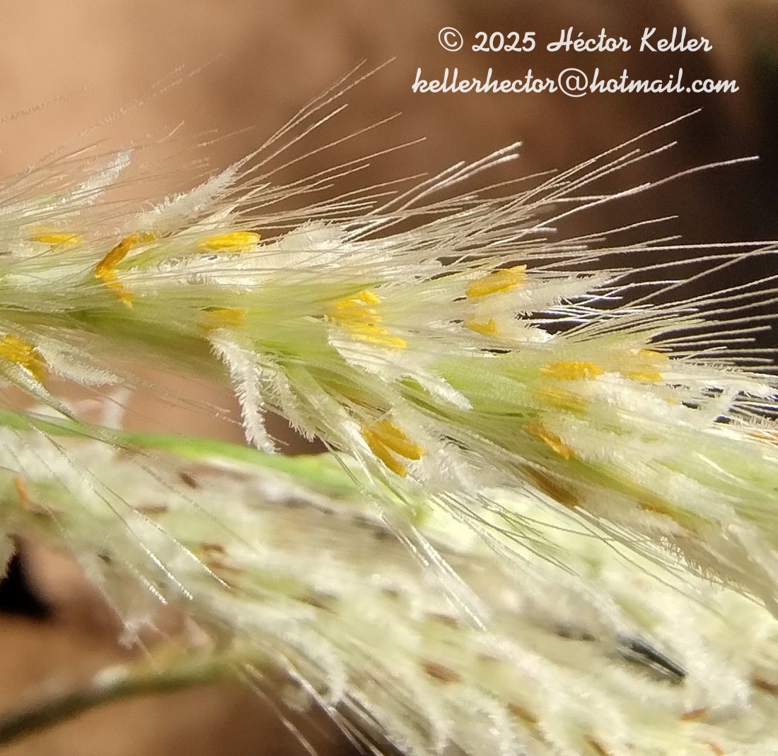 Plantas perennes, cespitosas, con rizomas cortamente tuberculiformes, cubiertos de vainas muertas; cañas herbáceas, ± robustas, huecas, de 1-3 m de alto y 5-15 mm de diámetro, levemente comprimidas, no ramificadas desde la base, con los entrenudos glabros y los nudos barbados excepcionalmente híspidos, formados por un anillo de pelos caducos, de 1-2 mm de largo; vainas glabras, hendidas, con margen membranáceo a veces ciliado, sin yema en su axila; lígulas pestañosas, formadas por un anillo de pelos cortos de 1,5-3 mm de largo; láminas planas, anchas, lanceoladas, de 12-35 x 1,5-3,5 cm, glabras o hirsutas, estrechadas en la base y de ápice agudo, nervio medio conspicuo. Inflorescencia con panojas espiciformes axilares y terminales dispuestas en forma alterna sobre un mismo eje, densas, exertas, castaño-pajizas, por lo general rectas, menos frecuentemente flexuosas, de 4-8 x 1-2 cm considerando las setas (0,7-1 cm de ancho excluyendo las setas); pedúnculos cilíndricos, filiformes, hasta de 10 cm de largo, exertos, rectos o algo curvos; raquis de la panoja tenue, longitudinalmente acanalado, pubescente, no dispuesto en zig-zag; involucro formado por (13-)15-40 setas lineal-escabrosas, desiguales en largo (aprox. ? son menores o iguales que la espiguilla y ? o menos son levemente mayores), de 3-8 mm de largo y una sola seta lineal-escabrosa, notablemente más larga que las restantes, de 8-15 mm de largo. Espiguillas lanceoladas, solitarias por involucro, muy caedizas, de (4-)4,5-6,5(-7) x 1-1,5 mm, subsésiles o cortamente pediceladas, glabras o escabrosas, 2-floras, con el antecio inferior generalmente neutro y el superior perfecto, base de la espiguilla con anillo de pelos; gluma inferior aguda, hialina, muy pequeña, de 0,3-1 mm de largo, enervia o 1-nervia, de ápice agudo o redondeado; gluma superior membranácea, de 1-2,5 mm de largo, 1-3-nervia, de ápice agudo u obtuso; lemma inferior subulada, escabroso-pubescente hacia el ápice, levemente mayor que el antecio fértil, de (3,8-)4-5,5(-5,8) x 1-1,5 mm, 5(-7)-nervia, de ápice agudo; pálea inferior ausente; lemma superior lanceolada, glabra, de (3,5-)3,8-4,5(-5) x 1-1,5 mm, 5-nervia, las nervaduras difusas, de ápice agudo; pálea superior levemente menor que la lemma, de (3-)3,5-4,5 mm de largo; estambres 3, anteras de 1-2 mm de largo, de ápice glabro, con los filamentos estaminales rara vez exertos; gineceo con las ramas estigmáticas exertas, de 1-2 mm de largo, estilos apenas soldados en la base; cariopsis no vista.