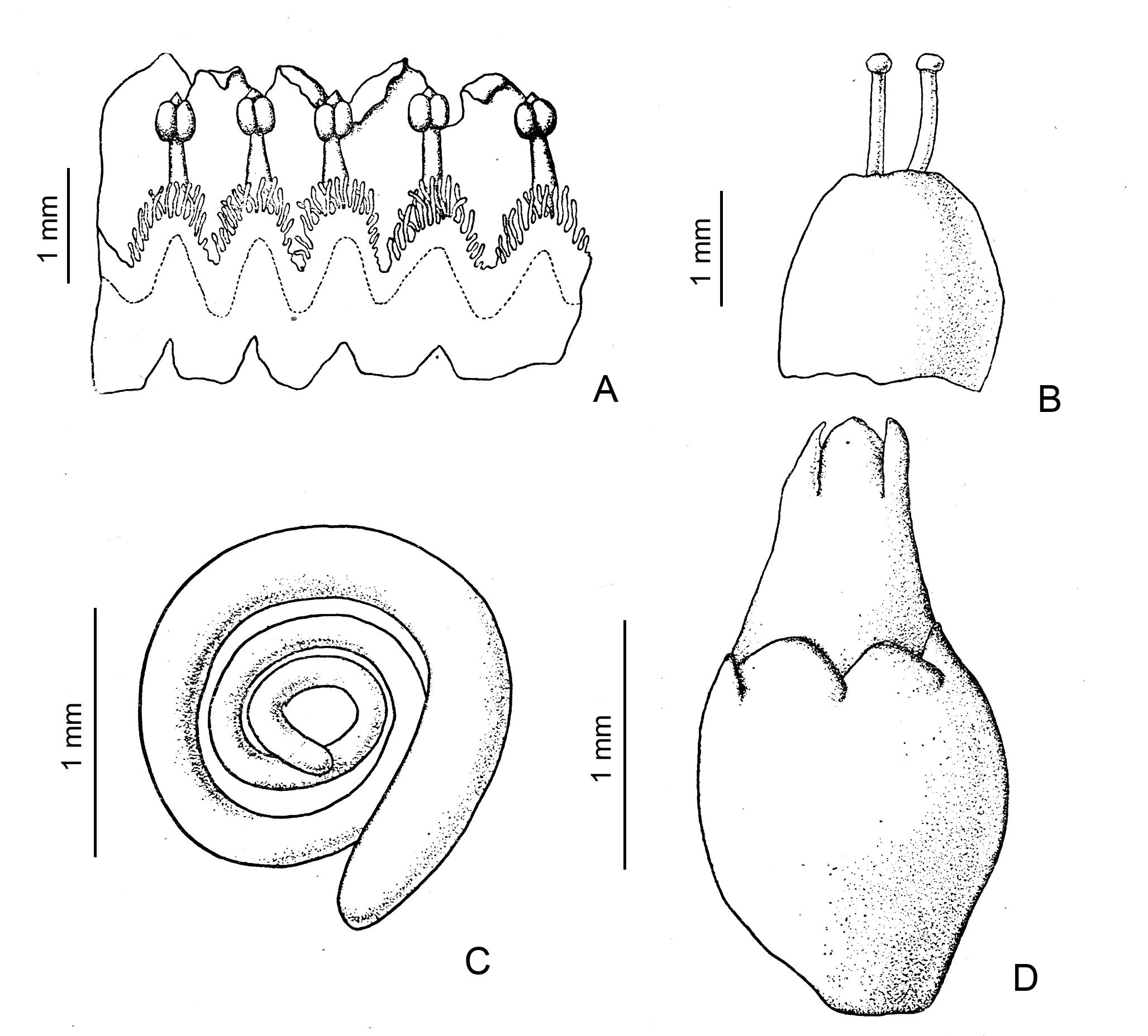 A. Corola desplegada. B. Gineceo. C. Embrión. D. Flor. Tomado de Trab. Mus. Bot. Córdoba 1(2). 209, fig. 23. 1950