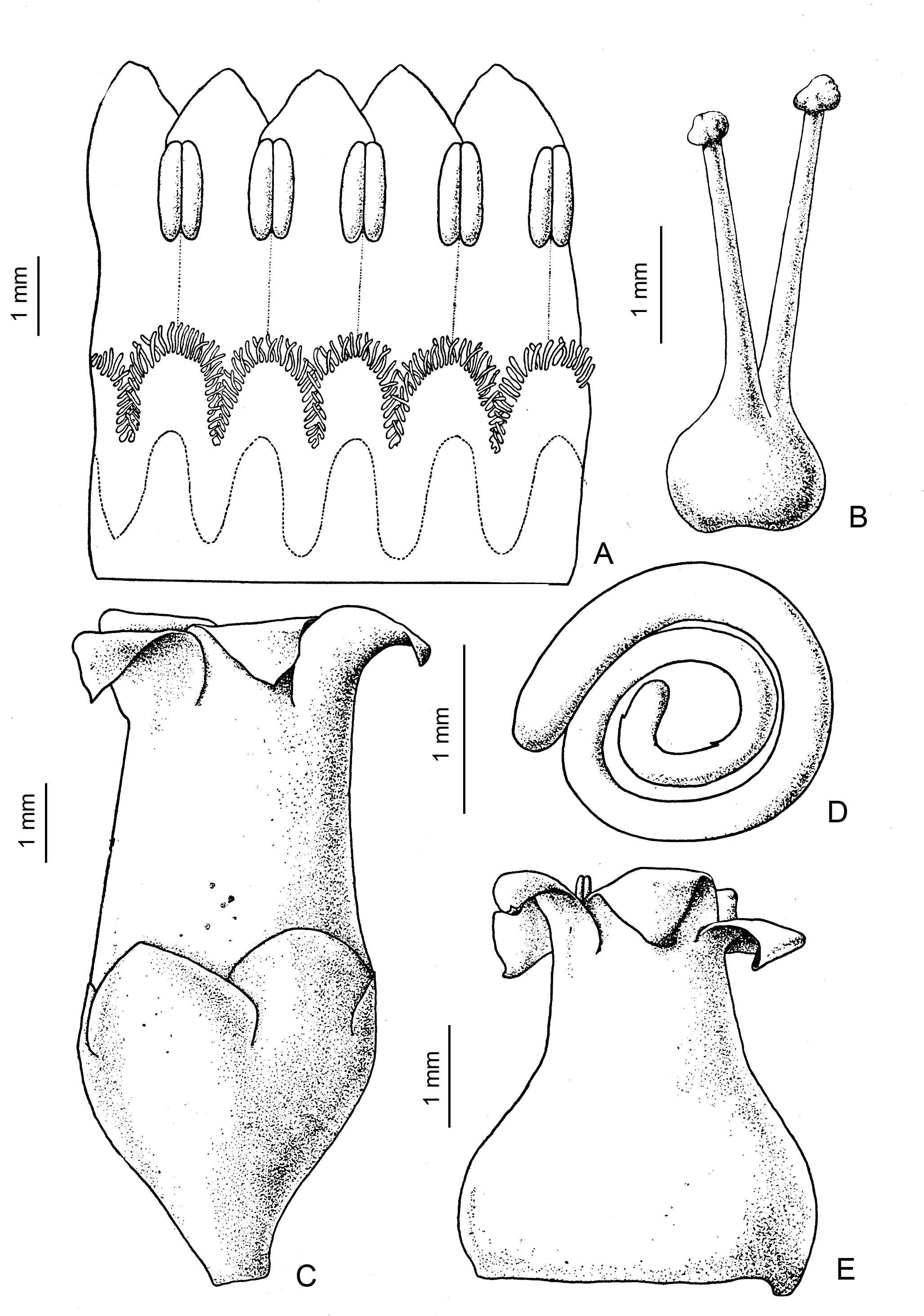 A. Corola desplegada. B. Gineceo. C. Flor. D. Embrión. E. Fruto desprovisto del cáliz y su parte basal. Tomado de Trab. Mus. Bot. Córdoba 1(2). 231, fig. 28. 1950