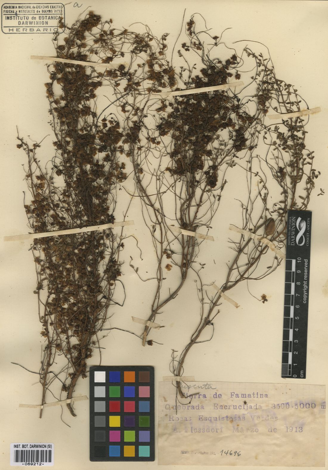 Material Tipo: Argentina. La Rioja. Dpto. Chilecito. Sierra de Famatina, Rodeo de Las Vacas, 3000-4000 m, Feb 1913, A. Flossdorf s.n. [n° 41 en el listado publicado] (holotipo, SI 001339; isotipos, SI 001340, SI 001341).