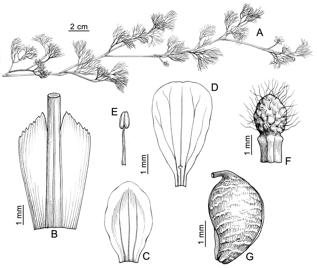 Hierba sumergida, a veces algunas hojas flotantes en el ápice; tallos delgados estriados. Hojas sumergidas hasta de 6 cm de largo, 3-partidas, segmentos varias veces divididos, lacinias filiformes, generalmente glabras, con algunos tricomas cortos o con ± pubescencia adpresa corta, blanquecina o amarillenta; pecíolo filiforme de hasta 27 mm de largo; vaina estipular amplexicaule, ovada, ± pubescente. Hojas flotantes reniformes o suborbiculares, de 7-20 × 5-20 mm, peltadas, 3-partidas, segmentos laterales subdivididos, todos ± lobulados, a veces lacinias angostas. Flores no sumergidas, solitarias o en cimas 2-floras axilares; sépalos 5, oblongos, elípticos, de ca. 3 × 1,5 - 2,5 mm, desiguales, generalmente asimétricos; pétalos 5, elípticos a oblongo-subespatulados, de 4,5-6 × 2-2,5 mm; escama nectarífera pequeña, circular, apenas aparente o ± horizontal u oblicua en la base del limbo; receptáculo subcónico, de 0,5 -1 mm de largo, con tricomas largos; estambres 10-15, de 1,5-2,5 mm de largo, ± desiguales; carpelos 15-40, semiovoides, de ± 0,5 mm de diámetro, dorso piloso. Frutos aquenios ovoideo-aplanados, de 2-3 mm de diámetro, asimétricos, ± marginados, estriados trasversalmente, glabros o pilosos en el dorso, pico corto.