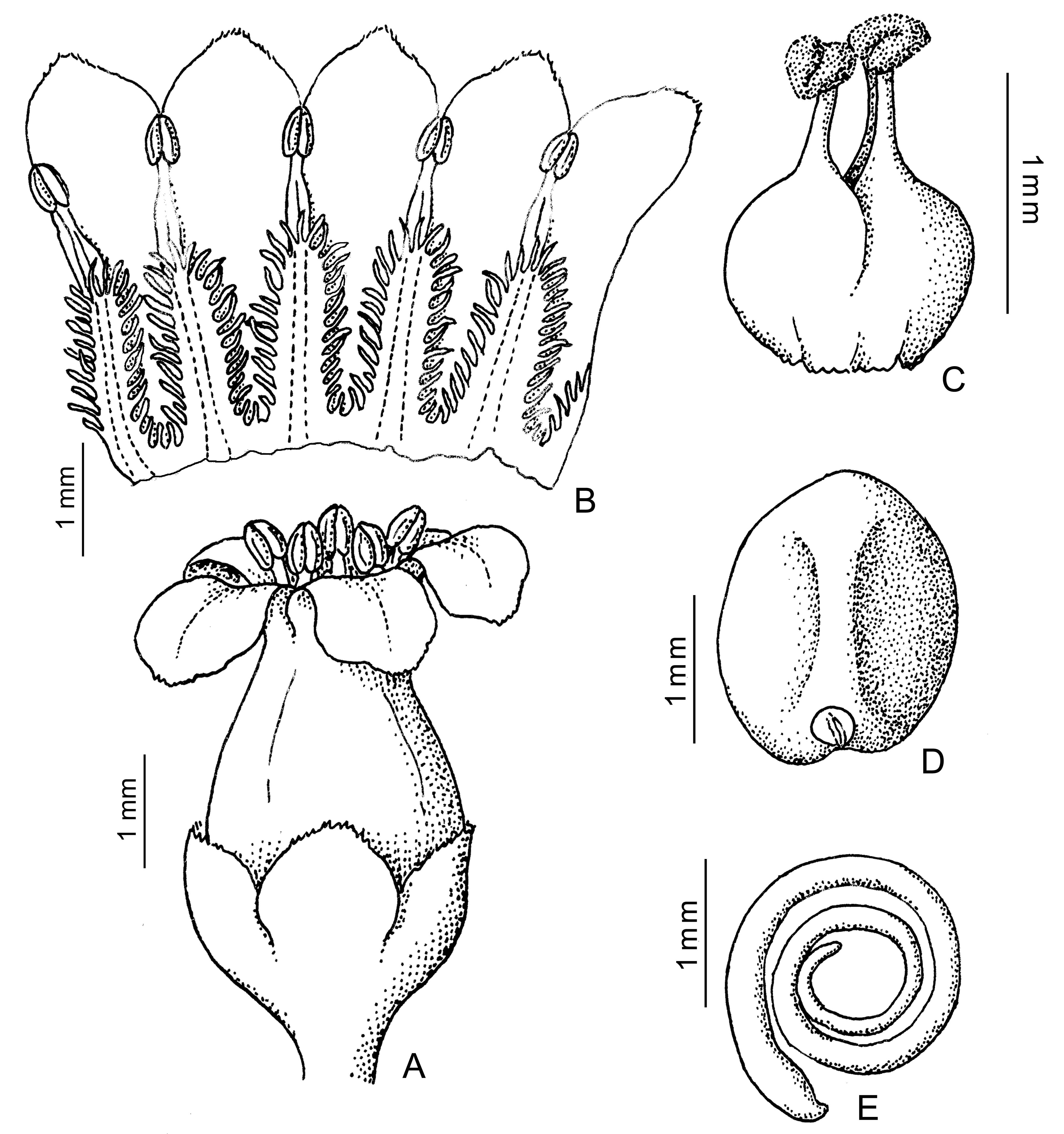 A. Flor. B. Corola desplegada mostrando las escamas infraestaminales. C. Gineceo, D. Semilla. E. Embrión.