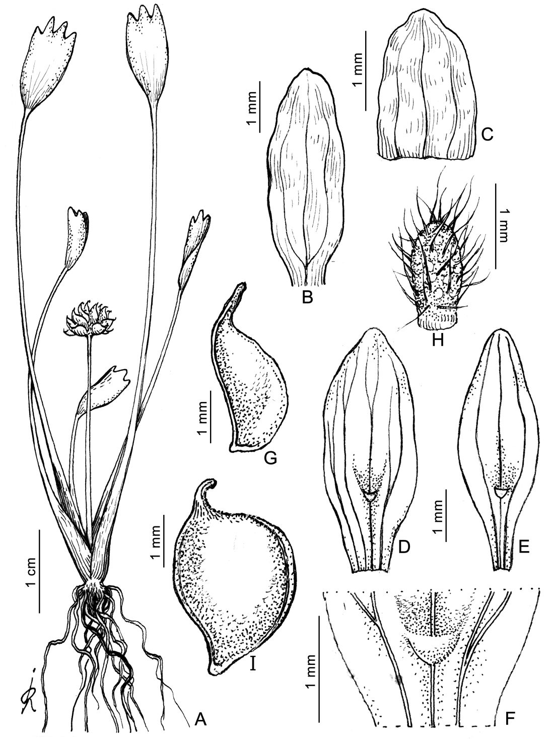 Hierbas glabras; raíces fi brosas, poco ramifi cadas. Hojas con pecíolos hasta de 14 cm de largo × 0,3 cm diámetro, gruesos, acanalados; vaina estipular ovada, de hasta 30 × 7 mm; lámina obovada, de 7-20 × 3-10 mm, cuneada, decurrente en el pecíolo, generalmente con bordes doblados sobre la cara adaxial. Flores solitarias; pedúnculos hasta de 10 cm de largo; sépalos 5, obovados, ovados u oblongos, de 3-5 × 1,3-3 mm, desiguales; pétalos 5, obovado u oblongo-subespatulados, de 4,5-6 × 1,3-2 mm, desiguales, amarillos; escama nectarífera a un tercio o más de la base, desigual, formando bolsillo con borde recto o apenas cóncavo; estambres 12, de 3-3,5 mm de largo; carpelos 10-16, semiovoides , ca. 2 mm de diámetro, asimétricos, estilos ± largos y curvos; receptáculo subcilíndrico, ca. 1 mm de diámetro, agudo, piloso. Fruto aquenios ovoides a subglobosos, de 3 × 1,5 mm, asimétricos, aplanados, levemente marginados, finamente foveolados, pico ± curvo.