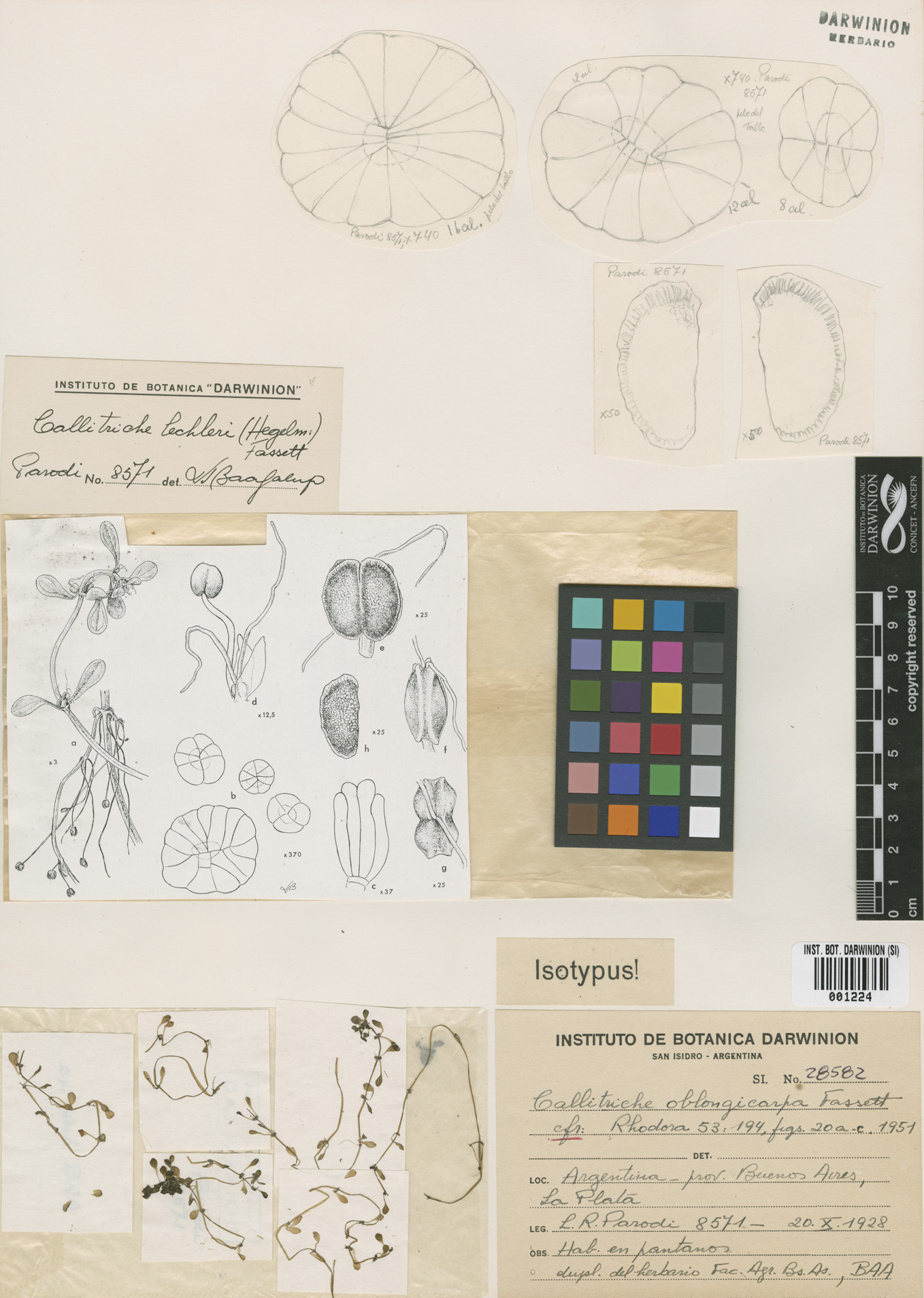 Hierba anfibia con hojas flotantes o totalmente sumergida. Hojas de 10-20 × 0,5-2,5 mm, iso o polimorfas, las sumergidas subuladas o lineares, traslúcidas, unidas entre sí, en cada nudo foliar por una vaina angosta, las no sumergidas más anchas, elípticas o espatuladas, opacas; pelos peltados presentes en los tallos; pelos flabelados en las axilas foliares. Flores bracteoladas, pistiladas y estaminadas solitarias o insertas en una misma axila foliar. Flores estaminadas con estambres de filamento casi nulo o hasta de 9 mm de largo, a menudo abortados en nudos sumergidos y acompañando frutos bien desarrollados. Flores pistiladas con estilodios filiformes, hasta de 5 mm de largo. Frutos de 0,9-1,4 × 0,7-1,4 mm, sésiles o pedicelados, más anchos que largos, o isodiamétricos, mericarpos ligeramente convexos en la cara lateral, con ala estrecha.