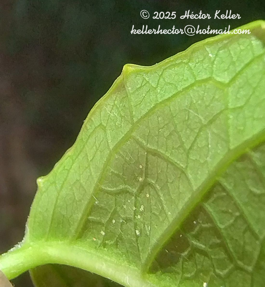 Lianas o arbustos seríceos a glabrescentes, con entrenudos de 2-9 cm de largo. Hojas con estípulas de 0,8-1 mm de largo; pecíolos de 2-4 mm de largo, canaliculados en la cara adaxial, glabrescentes; láminas ovadas, de 3-10 × 2-5 cm, de base aguda, ápice acuminado, en ocasiones mucronado. Inflorescencias en seudoracimos; brácteas de 1,5-2 mm de largo; pedúnculos florales de 2,5-4 mm de largo, seríceos; bractéolas de 0,8-1,1 mm de largo, seríceas; pedicelos de 6-7 mm de largo; sépalos de 2-2,5 mm de largo, con glándulas de 1,5-2 mm de largo; pétalos de 6-7 × 2,5-3 mm, el posterior con limbo más pequeño de 5-6 × 2-2,5 mm; androceo con filamentos de 3,5-4 mm de largo, con anteras de 0,9-1,1 mm de largo; ovario de 1-1,5 mm de largo, estilos el anterior de 3-3,1 mm de largo y los posteriores de 2-2,5 mm de largo. Mericarpos castaños, seríceos, de 0,4-0,6 × 0,3-0,4 cm.