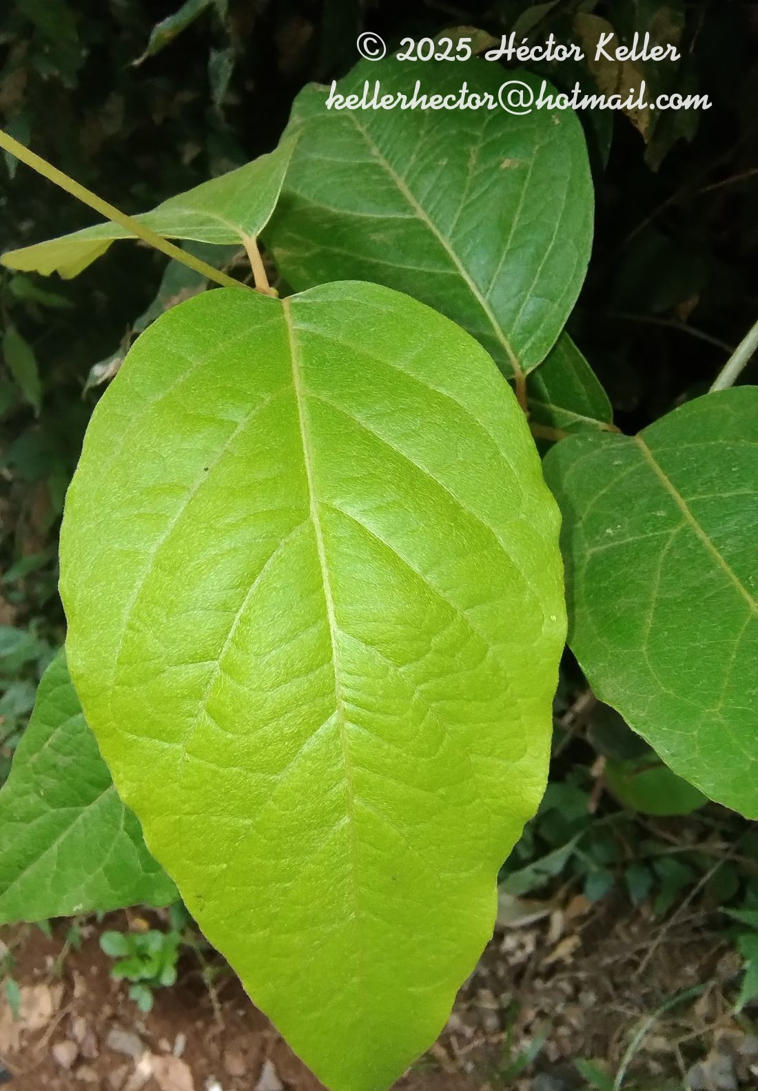 Lianas tomentosas a glabrescentes, con entrenudos de 3- 10 cm de largo. Hojas con estípulas escamiformes, de 0,3-0,5 mm de largo; pecíolos de 0,5-1,5 cm de largo, frecuentemente glabros, canaliculados en la cara adaxial, con 2 glándulas en la base; láminas elípticas, ovadas a obovadas, de 2,5-11 × 2,2-6,2 cm, de base aguda a obtusa, ápice acuminado, a veces emarginado, pubescentes en la cara abaxial, eglandulares. Inflorescencias terminales y axilares, en panículas de seudoumbelas o seudocorimbos; brácteas de 2-4 mm de largo; pedúnculos florales de 2,5-3,5 mm de largo, seríceos; bractéolas de 1-2 mm de largo, seríceas; pedicelos de 4-7 mm de largo, seríceos; sépalos oblongos, de 2,5-3 mm de largo, pubescentes, 4 biglandulosos y el anterior eglanduloso, glándulas elípticas, de 1-1,3 mm de largo; pétalos amarillos, de 4-5 × 2-2,2 mm, limbo obovado y margen denticulado, el posterior semejante, con uña más gruesa; androceo con filamentos triangulares, soldados en la base, de 2-2,5 mm de largo, glabros, generalmente los opositisépalos más largos y con filamentos más delgados, anteras suborbiculares, de 1- 1,2 mm de largo; ovario 3 carpelar, de 1,2-1,4 mm de largo, pubescente, estilos de 2,5-2,7 mm de largo, con ápice redondeado a truncado. Mericarpos samaroides, pardorojizos, ala dorsal oblonga, de 3-3,5 × 1-1,5 cm.