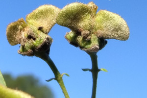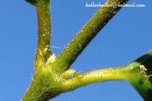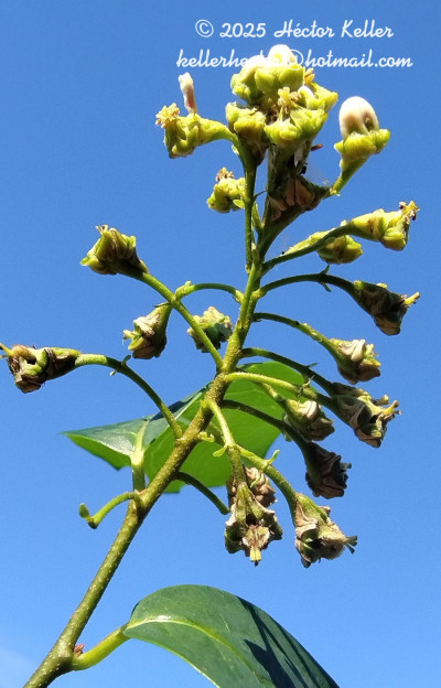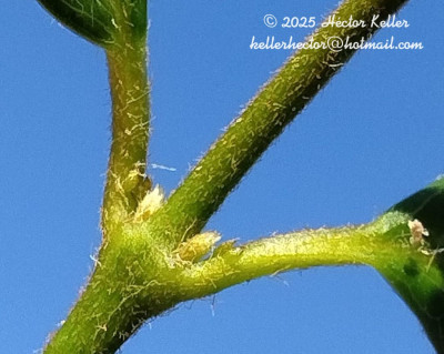 Arbustos trepadores, glabros a seríceos, con entrenudos de 3-5 cm de largo. Hojas con estípulas triangulares, de 0,2-0,4 mm de largo; pecíolos de 0,5-1 cm de largo, glabrescentes, con 2 pequeñas glándulas estipitadas cerca de la base; láminas ovadas a lanceoladas, de 7-9 × 2,5-3,5 cm, de base obtusa, ápice agudo, levemente pubescente en la cara abaxial, con 2-6 glándulas, distribuidas irregularmente. Inflorescencias terminales y axilares, simples, en seudoracimos; brácteas de 1,1-1,3 mm de largo; pedúnculos florales de 3-5 mm de largo, laxamente seríceos; bractéolas de 0,7-0,9 mm de largo, glabrescentes; pedicelos de 6-10 mm de largo, laxamente seríceos; sépalos ovados, de 1,8-2,2 mm de largo, pubescentes, 4 biglandulosos y el anterior eglanduloso, glándulas oblongas, de 1,6-1,8 mm de largo; pétalos blancos, de 3,8-4,5 × 2,2-2,7 mm, limbo oblongo, margen entero a crenado; androceo con filamentos delgados, soldados en la base, de 2,3-2,7 mm de largo, anteras oblongas, de 0,9-1 mm de largo; ovario 3 carpelar, de 1,4-1,6 mm de largo, pubescente, estilos de 1,8-2,2 mm de largo, con ápice uncinado. Mericarpos samaroides, ala dorsal oblonga, de 0,7-1,2 × 0,6-0,8 cm.
