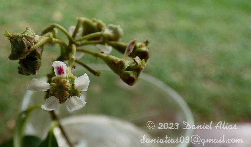 Arbustos trepadores, glabros a seríceos, con entrenudos de 3-5 cm de largo. Hojas con estípulas triangulares, de 0,2-0,4 mm de largo; pecíolos de 0,5-1 cm de largo, glabrescentes, con 2 pequeñas glándulas estipitadas cerca de la base; láminas ovadas a lanceoladas, de 7-9 × 2,5-3,5 cm, de base obtusa, ápice agudo, levemente pubescente en la cara abaxial, con 2-6 glándulas, distribuidas irregularmente. Inflorescencias terminales y axilares, simples, en seudoracimos; brácteas de 1,1-1,3 mm de largo; pedúnculos florales de 3-5 mm de largo, laxamente seríceos; bractéolas de 0,7-0,9 mm de largo, glabrescentes; pedicelos de 6-10 mm de largo, laxamente seríceos; sépalos ovados, de 1,8-2,2 mm de largo, pubescentes, 4 biglandulosos y el anterior eglanduloso, glándulas oblongas, de 1,6-1,8 mm de largo; pétalos blancos, de 3,8-4,5 × 2,2-2,7 mm, limbo oblongo, margen entero a crenado; androceo con filamentos delgados, soldados en la base, de 2,3-2,7 mm de largo, anteras oblongas, de 0,9-1 mm de largo; ovario 3 carpelar, de 1,4-1,6 mm de largo, pubescente, estilos de 1,8-2,2 mm de largo, con ápice uncinado. Mericarpos samaroides, ala dorsal oblonga, de 0,7-1,2 × 0,6-0,8 cm.