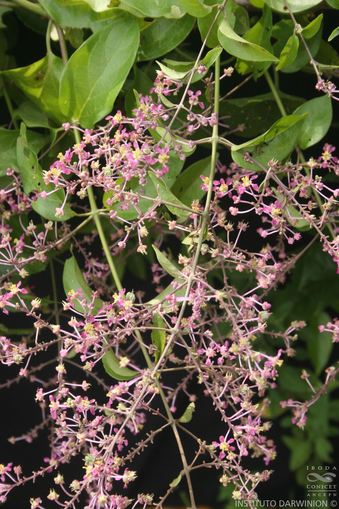 Lianas seríceas a glabrescentes, con entrenudos de 4- 13 cm de largo. Hojas con estípulas interpeciolares, de 0,5- 1 mm de largo, angostamente triangulares, seríceas; pecíolos de 1-2 cm de largo, glandulosos, seríceos; láminas elípticas u ovadas, de 6-13 × 4-6 cm, de base redondeada, ápice acuminado, con glándulas en la cara abaxial, escasamente seríceas a glabrescentes en ambas caras. Inflorescencias en seudoracimos compuestos; brácteas de 1-1,6 mm de largo, lineales, eglandulares; pedúnculos florales de 1-2,5 mm de largo, en general seríceos; bractéolas de 0,9-1,1 mm de largo, en general seríceas en la cara abaxial, erosas, laciniadas; pedicelos de 9-11 mm de largo; sépalos ovados, de 1,5-2 mm de largo, ligeramente pubescentes en la cara abaxial, glándulas oblongas, de 1-1,2 mm de largo; pétalos rosados, de 4-5 × 2,8-3,5 mm, limbo oblongo y cóncavo, márgenes levemente fimbriados, el posterior más plano y con uña más gruesa; androceo con filamentos desiguales, de 2,5-3 mm de largo, los opositisépalos más cortos, anteras ovoides, de 1-1,2 mm de largo, pilosas; ovario de 1,4-1,6 mm de largo, pubescente, crestado dorsalmente, estilos de 2,3-2,7 mm de largo, el anterior recto y los posteriores lirados, con ápice acuminado. Mericarpos samaroides con alas membranáceas, reticuladas, alas laterales de 2-2,5 × 1,5-1,7 cm, orbiculares, ápice con hendidura variable, base entera, ala dorsal de 0,6-1 × 0,2-0,3 cm.