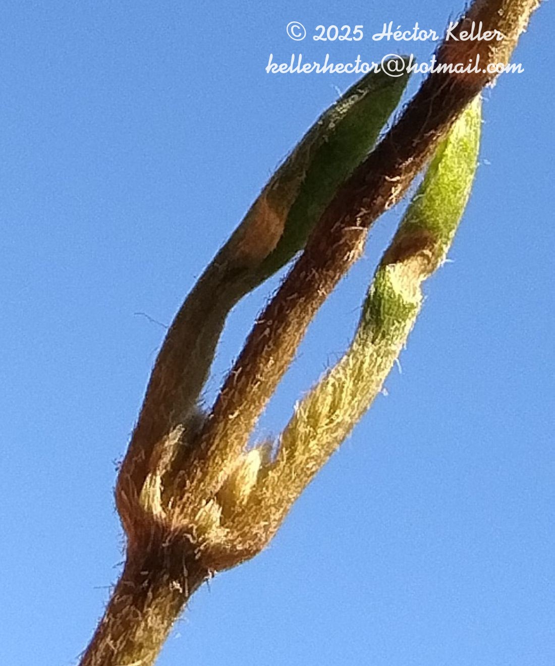 Lianas seríceas a glabrescentes, con entrenudos de 4- 13 cm de largo. Hojas con estípulas interpeciolares, de 0,5- 1 mm de largo, angostamente triangulares, seríceas; pecíolos de 1-2 cm de largo, glandulosos, seríceos; láminas elípticas u ovadas, de 6-13 × 4-6 cm, de base redondeada, ápice acuminado, con glándulas en la cara abaxial, escasamente seríceas a glabrescentes en ambas caras. Inflorescencias en seudoracimos compuestos; brácteas de 1-1,6 mm de largo, lineales, eglandulares; pedúnculos florales de 1-2,5 mm de largo, en general seríceos; bractéolas de 0,9-1,1 mm de largo, en general seríceas en la cara abaxial, erosas, laciniadas; pedicelos de 9-11 mm de largo; sépalos ovados, de 1,5-2 mm de largo, ligeramente pubescentes en la cara abaxial, glándulas oblongas, de 1-1,2 mm de largo; pétalos rosados, de 4-5 × 2,8-3,5 mm, limbo oblongo y cóncavo, márgenes levemente fimbriados, el posterior más plano y con uña más gruesa; androceo con filamentos desiguales, de 2,5-3 mm de largo, los opositisépalos más cortos, anteras ovoides, de 1-1,2 mm de largo, pilosas; ovario de 1,4-1,6 mm de largo, pubescente, crestado dorsalmente, estilos de 2,3-2,7 mm de largo, el anterior recto y los posteriores lirados, con ápice acuminado. Mericarpos samaroides con alas membranáceas, reticuladas, alas laterales de 2-2,5 × 1,5-1,7 cm, orbiculares, ápice con hendidura variable, base entera, ala dorsal de 0,6-1 × 0,2-0,3 cm.