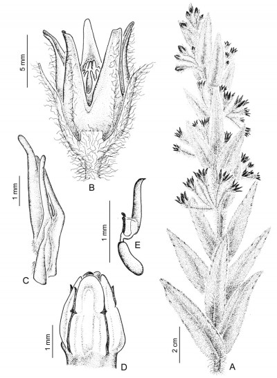 Hierba de 30-60 cm de alto, erecta, tallo poco ramificado, indumento incano. Hojas con pecíolo de 1 mm de largo, incano, subsésiles hacia el ápice de la planta; lámina oblongo-ovada a oblongo-lanceolada, de 3-4,5 × 0,5-2,5 cm, erguida, ápice agudo, base redondeada, con coléteres en la base de la cara adaxial de la vena media, pubescencia incano-vilosas en ambas caras, más densas en la cara abaxial. Inflorescencias umbeliformes, extraaxilares, con 3-7 flores, pedúnculo de 0,5-1 cm de largo, lanoso. Flores con pedicelo de 0,75-2 cm de largo, lanoso, cáliz partido casi hasta la base, con un coléter en el seno interno, lóbulos ovado-lanceolados, de 6-7 × 2-2,5 mm, cara abaxial lanosa, cara adaxial glabra con coléteres en el seno; corola con tubo campanulado de 3-3,5 mm de largo, castaña, lóbulos ovado-lanceolados, de 8 × 3 mm, erectos carenados, cara abaxial pilosa, cara adaxial glabra; corona con lóbulos carnosos de 5 mm de largo, 2-fidos, con apéndice interno más largo que los laterales, glabra; ginostegio cortamente estipitado de 3 mm de largo, con apéndice de la cabeza estilar breve, incluso, 2-fido; anteras subcuadrangulares, de 1,3-1,4 mm de largo, membrana apical ovada, de 1 × 0,8 mm; polinarios con un retináculo linear, de 0,83-0,96 × 0,14-0,15 mm, caudículas de 0,45 × 0,35-0,40 mm, subhorizontales, con diente lateral curvo, polinios oblongo-ovoides, de 0,7 × 0,25-0,30 mm. Folículos fusiformes, de 12 cm de largo, erectos, aguzados en los extremos, tomentosos. Semillas numerosas, obovadas, de 5-6 × 2,5-3 mm, marginadas, verrucosas.