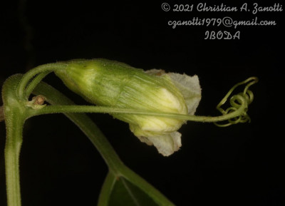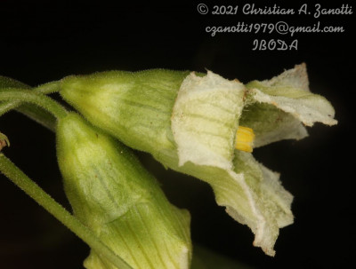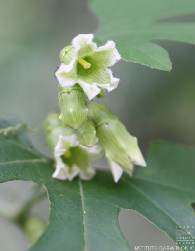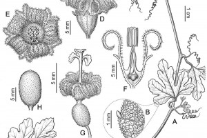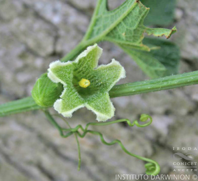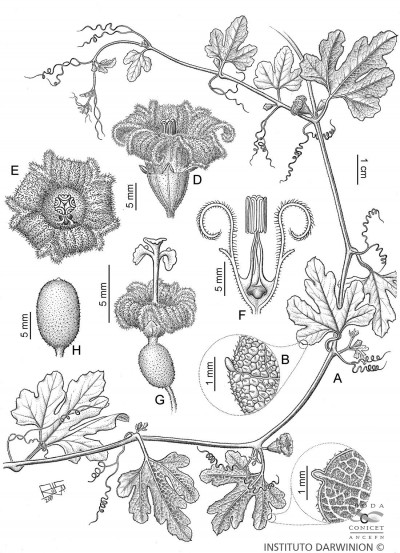 Hemicriptófitos dioicos; tallos plurimetrales. Hojas basales enteras, 5-anguladas hasta 5-pedatipartidas, láminas de 7-15 × 7- 15 cm, rígidas o membranácea; hojas de los nudos con inflorescencias 3-palmatipartidas; brácteas subuladas, pequeñas, a veces foliosas, deltoideas. Zarcillos simples o 2-fidos. Flores solitarias, fasciculadas o en monocasios racemiformes; antesis diurnia (de 12 a 16h), con perfume a manzanas verdes. Flores estaminadas con hipanto de 10-12 × 9-10 mm; sépalos de 1-2 × 2 mm; pétalos de 10 × 8 mm, márgenes induplicados, anchos, con pubescencia algodonosa, blanca, en la haz, tomentosos en el envés, revolutos en la antesis; filamentos de 7-9 mm de largo, base pilosa, sinandro de 5-6 mm de largo. Flores carpeladas menores que las estaminadas; pétalos oblongos, revolutos en la antesis, márgenes induplicados, angostos; ovario esférico de 3 mm de diámetro; rudimentos seminales 3; estigma con 3 lóbulos espatulado-peltados, lisos. Bayas de 10-14 × 6-8 mm, rojizas. Semillas de 5-7 mm de largo, castañas, pajizas o moteadas.