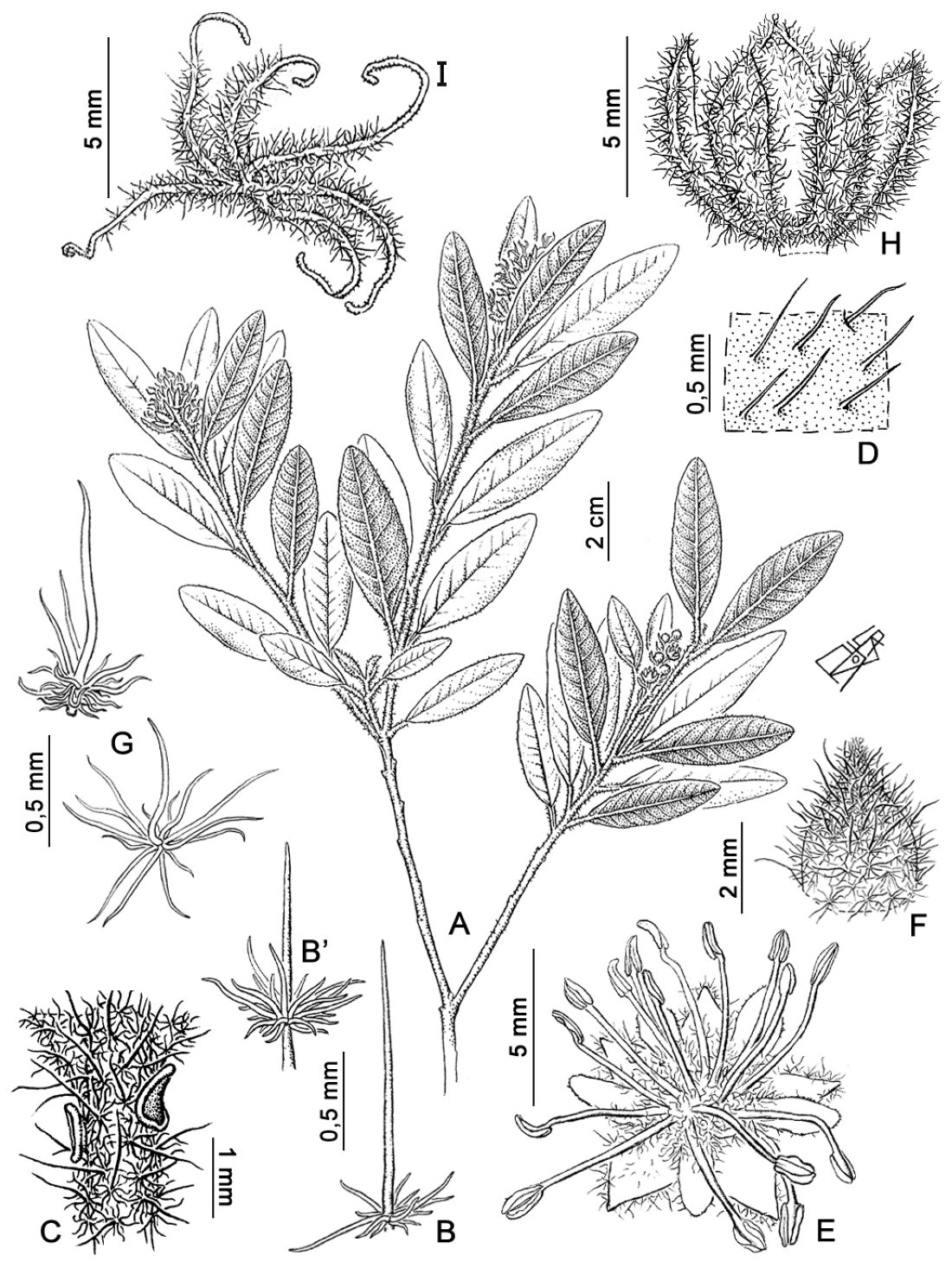 A. Planta. B-B’. Tricomas del tallo. C. Glándulas pateliformes basilaminares/acropeciolares. D. Tricomas del haz foliar. E. Flor estaminada. F. Sépalo estaminado, vista externa. G. Tricomas del cáliz pistilado. H. Cáliz pistilado, vista externa. I. Estilos.