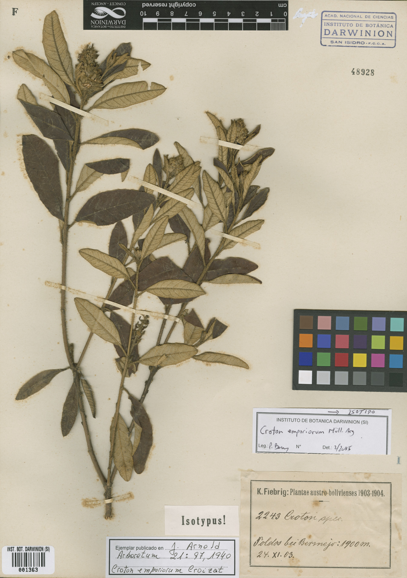 Observaciones: Especie afín a C. reitzii, a la cual se asemeja por las hojas corto-pecioladas, lanudas en la cara abaxial y verde brillante en la cara adaxial y las inflorescencias densas, casi capituladas. Croton hilarii se diferencia por las hojas más elípticas y agudo-redondeadas en el ápice y las inflorescencias más laxas. Tiene además una distribución más amplia, desde los bosques andinos en Salta y Bolivia hasta los cerros del centro y sureste de Uruguay y los altiplanos de Brasil meridional. Cuando Fiebrig recolectó el material original de Croton emporiorum en 1903, Toldos formaba parte de Bolivia. Después del tratado de límites entre Argentina y Bolivia, en vigor desde 1938, Toldos se encuentra dentro del territorio argentino.