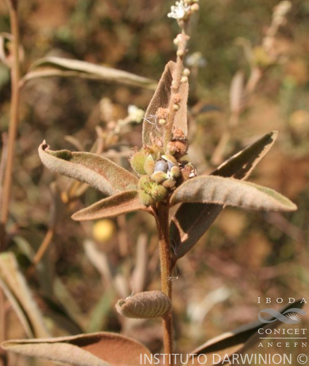 Subarbustos monoicos o subdioicos de 20-80 cm de alto, ocasionalmente arbustos hasta de 1,5 m de alto, con raíz central gruesa, generalmente bien ramificados desde la base, ramas jóvenes con indumento denso de tricomas estrellados estipitados, porrectos, de radio central vertical, más corto que los radios horizontales, éstos orientados en su mayoría en sentido longitudinal. Hojas alternas; pecíolos de 3-7(-13) mm de largo; estípulas subuladas o pequeños dientes, de dorso pubescente y ápice glanduloso, casi ocultas por el indumento del tallo; láminas elípticas, lanceoladas, ovales o rara vez obovadas, de 2-6(-9) × 1,5-4 cm, nervios secundarios 4-7 a cada lado de la nervadura central, poco visibles, ápice obtuso, a veces agudo, apiculado, base aguda a subcordada, margen entero y eglanduloso, glándulas 2, pateliformes-umbonadas y sésiles de 1-1,3 mm de diámetro en la base de la cara abaxial, indumento denso, más acentuado en la cara abaxial, de tricomas estrellados corto-estipitados. Inflorescencias terminales, 2-sexuales o 1-sexuales, de 2-13 cm de largo, las 2-sexuales con 1-6 flores pistiladas y 10-30 flores estaminadas distales; brácteas triangular-alesnadas, de 1,5-2 mm de largo, a menudo con 1 o 2 glándulas adyacentes discoides o semilunadas, frecuentemente de un solo lado del pedicelo de la flor pistilada; brácteas de las flores estaminadas aciculares, sin glándulas discoidales o presentes en las brácteas de flores estaminadas inferiores, brácteas basales con flores pistiladas solitarias, las apicales con flores estaminadas en címulas 1-laterales de 2-3 flores. Flores estaminadas con pedicelo de 1-2,6 mm; sépalos 5, ovales, de 1,7-3 × 0,9-1,8 mm, dorso pubescente; pétalos 5, espatulados, de 2,5-3 × 0,6-1,1 mm, barbados en la base y pilosos en el margen; estambres 12-17, filamentos pilosos en la base; disco de 5 lóbulos libres, glabros. Flores pistiladas subsésiles; sépalos 5, triangulares, de 1,5-3 mm de largo, iguales o desiguales, densamente pubescentes en la cara externa, glabros o con tricomas ralos en la cara interna; pétalos atrofiados, filiformes o subulados, con glándula apical, a veces poco visibles, glabros o con tricomas ralos; disco 5-lobado; ovario subgloboide o de contorno oblongo, de 1-1,5 × 1,5-1,8 mm, densamente pubescente; estilos 3, 2-fidos, con 6 terminaciones estigmáticas de 2,5-5 mm de largo, las ramas pubescentes desde erguidos hasta patentes en la antesis. Fruto cápsulas oblongo-globoides, de 5-7 × 4-5,5 mm, tomentosas, con tricomas estrellados uniformes; columela de 4-5,5 mm de largo, con 3 lóbulos lisos, agudos y ascendentes. Semillas oblongo-elipsoides, de 4-6 × 3-4 mm, pardas a negruzcas, lisas; carúncula subapical blancuzca, lateralmente alada y 2-cornulada en el ápice.
