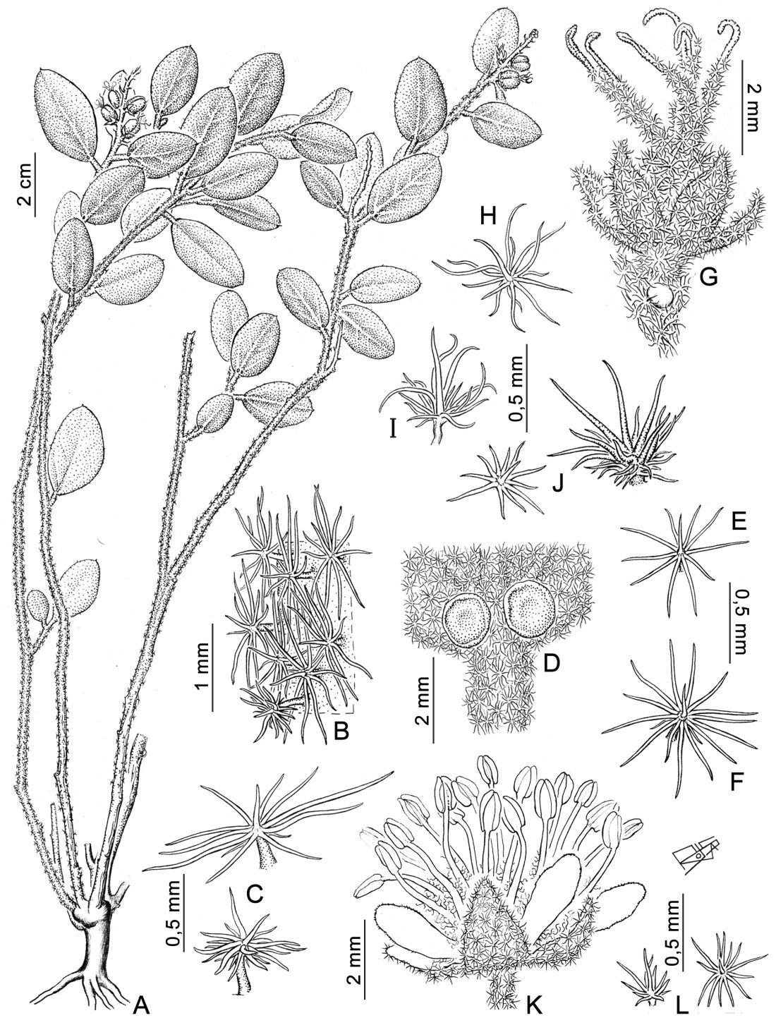A. Planta pistilada, antes considerada como Croton lorentzii. B-C. Tricomas estrellados del tallo. D. Glándulas de la base del envés foliar. E. Tricoma del haz foliar. F. Tricoma del envés foliar. G. Flor pistilada, con glándula en la base de la bracteola. H. Tricoma del sépalo pistilado, cara externa. I-J. Tricomas del ovario. K. Flor estaminada. L. Tricomas de los sépalos estaminados, lado externo.