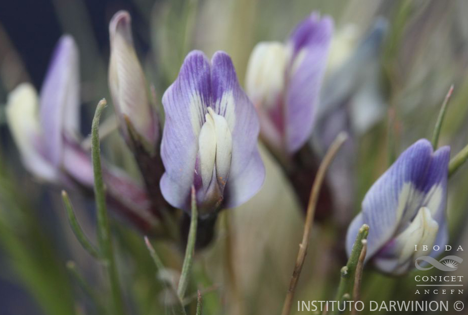 Hierba de ca. 10-20 cm alt., perenne, baja, subarrosetada, subespinescente por los raquis foliares persistentes. Tallo con base persistente, subleñosa, formando "corona" de 1-2 cm alt., tallos aéreos de 1,5-4 cm alt. Hojas aproximadas, erguidas, 3-5-yugadas con impar; estípulas de 2-6 mm, amplexicaules, membranáceo-hialinas, bidentadas, glabras, ci¬liadas; pecíolo breve, raquis foliar rígido, recto, formando un órgano de (1) 3-18 cm, su¬bulado, endurecido, subpunzante, estrigoso-glabrescente a glabro; folíolos de 5-12 x 0,4-1 mm, caedizos, lineares, distanciados en el raquis, opuestos a casi alternos, agudos a mu¬cronados, herbáceos, ralamente estrigosos, conduplicados, en seco rectos o levemente arqueados o en S amplia. Pedúnculos de ca. 3-9 cm, en antesis erectos, luego encorvados hacia tierra, estrigosos, (2-)4-5-floros; brácteas de 2-3 mm, triangular-lanceoladas, bracté¬olas de ca. 2 mm; pedicelos de 2-3 mm. Flores de 1,95 mm, azules; cáliz con tubo de 5-5,5 mm y dientes de 4-4,5 mm. Vexilo de 1 cm de ancho, oblongo-ovado, bordes re-flexos, alas de 1,6-1,7 x 0,3 cm, rectangulares, obtusas; quilla de 1,3 cm. Ovario seríceo con ca. 34 óvulos. Legumbre de 2-3 x 1-1,5 x 0,6 cm grosor, elipsoide, 1-locular, mucro-nada, coriácea, trasversalmente rugulada por la venación en resalto, estrigosa, pericarpo a veces maculado o jaspeado de púrpura pálido, ambas suturas cordiformes, la placentar de ca. 1 mm de ancho.