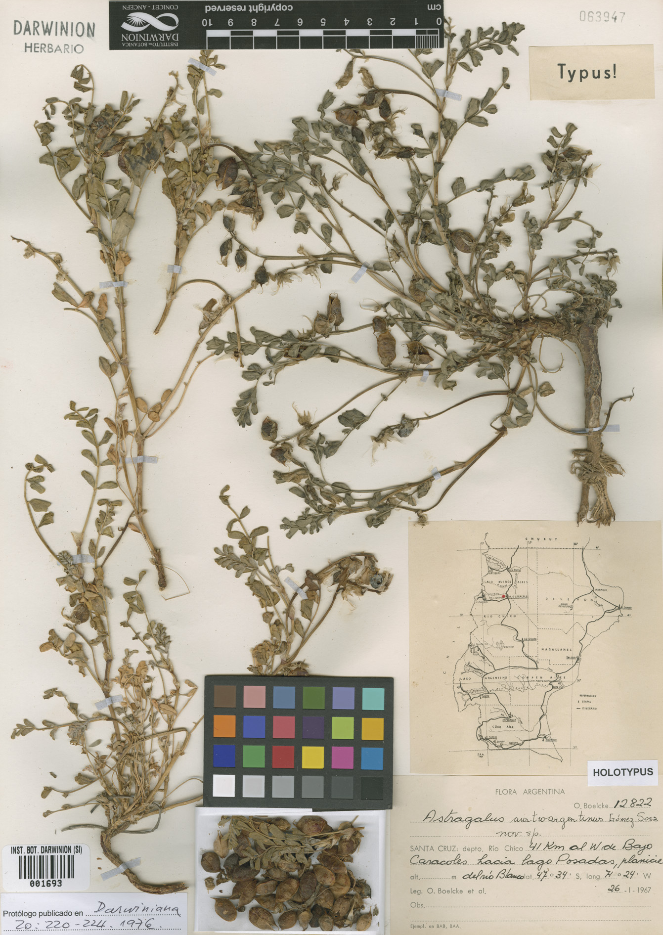 Material Tipo: Argentina. Santa Cruz. Dpto. Río Chico. 41 km al W de Bajo Caracoles, hacia lago Posadas, planicie del río Blanco, 47°34'S, 71°24'W, 26 Ene 1967, O. Boelcke 12822 (holotipo, SI 001693; isotipos, BAA 00001172, BAA 00001173, BAB 00000312, E 00251174, K 000858607, MO-2246307, SI 001694, SI 001695).