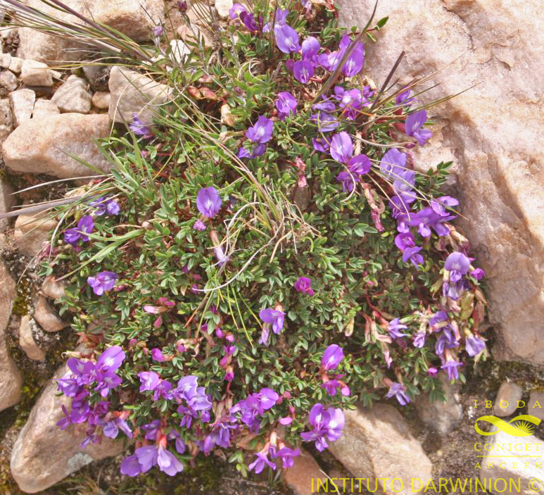 Hierba cespitosa de ramas intrincadas, pulviniformes; tallos con entrenudos breves s y compactados hacia la base, semienterrados . Hojas imparipinnadas, de 1-3(-4) cm long., congestionadas hacia el ápice de las ramas; estípulas de 3-5 mm long., amplexicaules, brevemente bidentadas, ápice estrigoso- glabrescente; folíolos (3-) 5-6 pares, elípticos de 2-5 mm long. x 1-3 mm lat., conduplicados, superficie adaxial glabra y abaxial adpreso-villoso. Racimos de 2-4 flores conspicuas, de 1,6 cm long., estandarte azul-violáceo, reflexo y con uña bien desarrollada; alas y quilla de menor tamaño; ovario glabro. Legumbre unilocular, coriácea, glabra, oblonga de base obtusa y ápice agudo, sutura placentar engrosada. Semillas 10-15, ca. 2,5 mm diám.