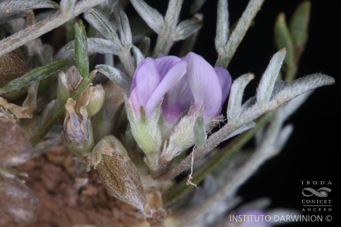 Hierba laxamente cespitosa, tallos ascendentes de 0,3-1 cm long.; estípulas glabras imbricadas. Hojas imparipinnadas, raquis desnudo en su mitad inferior, folíolos sericeo-pubescentes, 2-3 pares, 8-19 mm long. x 1-2 mm lat, lineares, conduplicados, marcadamente distantes entre sí. Pedúnculos 2-15 mm long., menores que las hojas, con 2-6 flores con pedicelos de 0,5-1 mm long.; brácteas y bractéolas presentes. Flores azul-celestes; cáliz de 3,5-4 mm long., incluído los dientes; estandarte obovado con ápice emarginado; alas angostamente rectangulares, generalmente con ápice involuto; quilla obtusa menor que las alas. Ovario 10-12-ovulado Legumbre papirácea, oblonga, laterodorsiventralmente compresa, borde placentar recto; subbilocular por sutura inferior invaginada seguida de reborde membranoso de 0,5 mm lat., estrigosa glabrescente. .