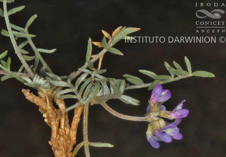 Hierba cespitosa, cericeo-pubescente; tallos de 1-2(-3) cm long. con entrenudos apretados cubierto por las estípulas imbricadas. Hojas pecioladas, imparipinadas de 4-5 cm long., estípulas adosadas al pecíolo, glabras; 7-9 (-13) pares de folíolos, de 7-10(13) mm long.x 1,5-3(-4) mm lat., distanciadas en el raquis, elípticos con ápice agudo y generalmente con base cuneada. Pedúnculos de 2-4(-6) cm long., menores que las hojas, con 3-8(-10) flores azules, pediceladas, estandarte a veces con aurícula y /o escotaduras, de ápice emarginado, de 7-10(-11) mm long. x 3,5-5,5 mm long., alas y quilla de menor tanaño. Ovario blanco- pubescente, ca. 14-ovulado s. Legumbre oblonga, subfalcada, papirácea, unilocular, con compresión lateral y corte transversal triangular, estrigoso-pubescente, de (7-)9-11(-13) mm long. x 2-4,5 mm lat. Semillas ca. 15.