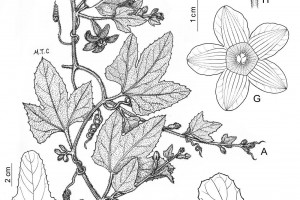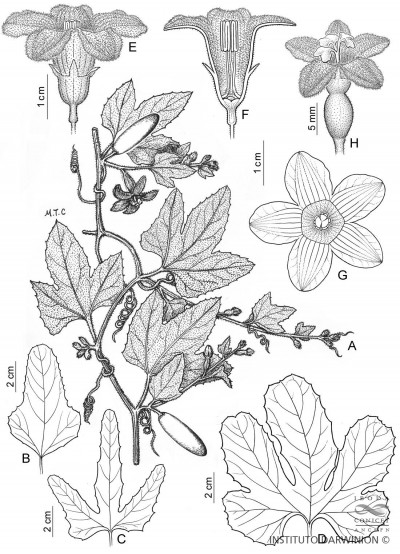 Hemicriptófitos dioicos; tallos plurimetrales. Hojas 3- palmatipartidos, con pecíolos de 10-25 mm de largo y láminas de 5-10 × 4-9 cm; brácteas enteras, deltoideas. Zarcillos simples, raro 2-fidos. Flores estaminadas solitarias o en monocasios paucifloros; hipanto de 5 × 6-7 mm, más una prolongación basal tubular de 10-12 mm de largo; sépalos lanceolados, de 5-7 mm; pétalos de 13-15 × 8-10 mm, verdosos, con pubescencia algodonosa, blanca, en la haz, extendidos, patentes; filamentos estaminales de 9-10 mm de largo; sinantéreo de 7-9 × 5-6 mm. Flores carpeladas solitarias, de menor tamaño; rudimentos seminales 9-12; estilo arqueado; estigma con 3 lóbulos espatulado-peltados, lisos. Bayas oblongas, de 25-35 × 13-20 mm, rojas. Semillas de 8-13 × 5-6 × 2 mm.